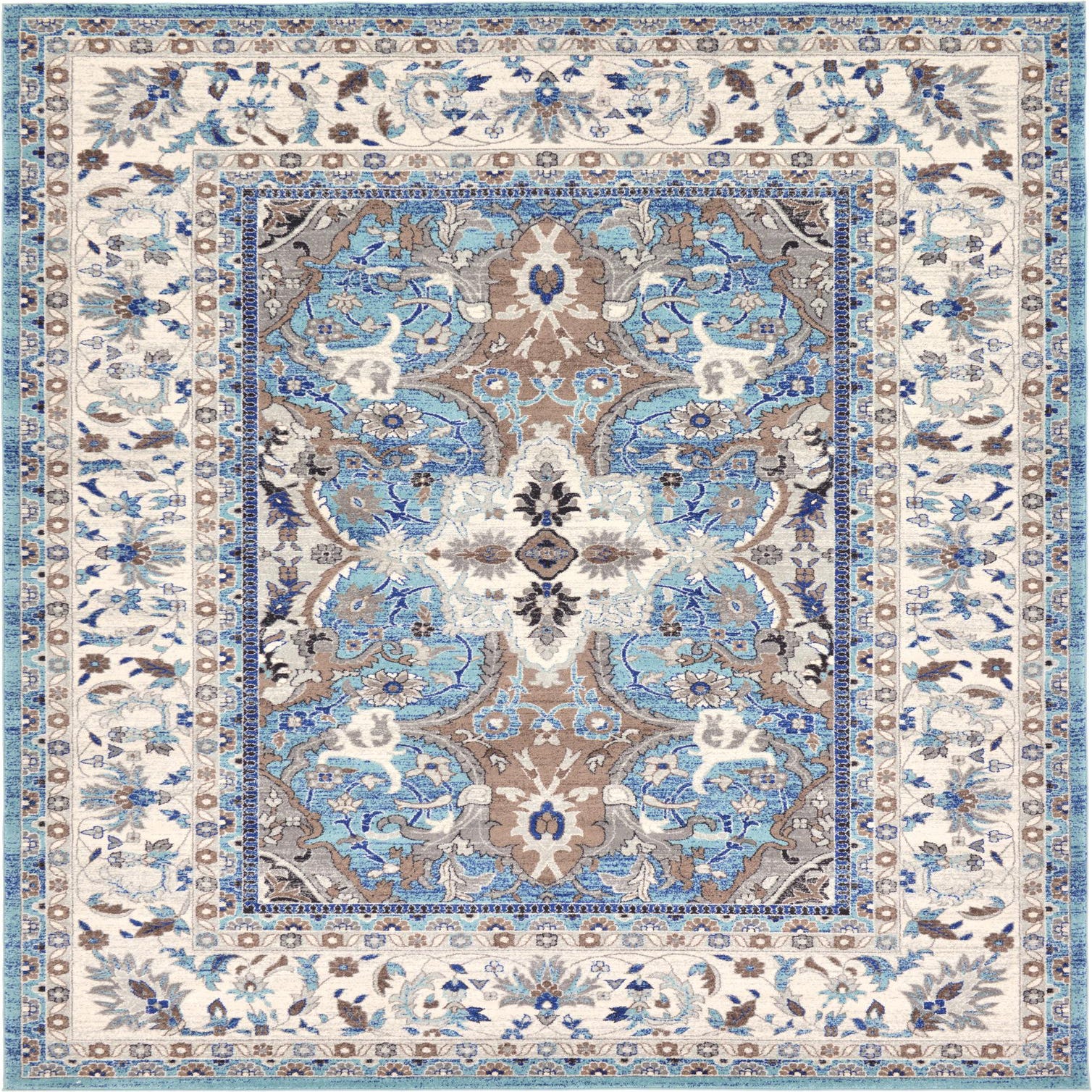 Primary color is Light Blue. Colors in this rug include: Light Blue, Black, Blue, Gray, Ivory.