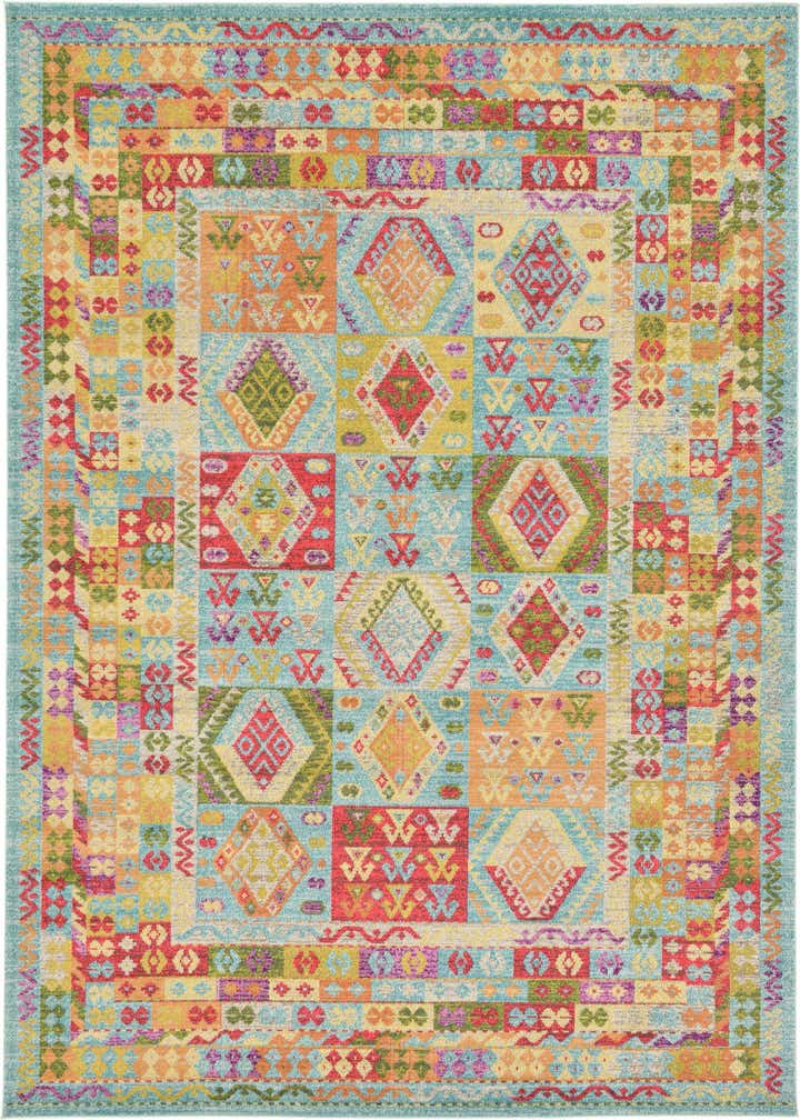 Primary color is Light Blue. Colors in this rug include: Light Blue, Green, Orange, Peach, Red, Purple.