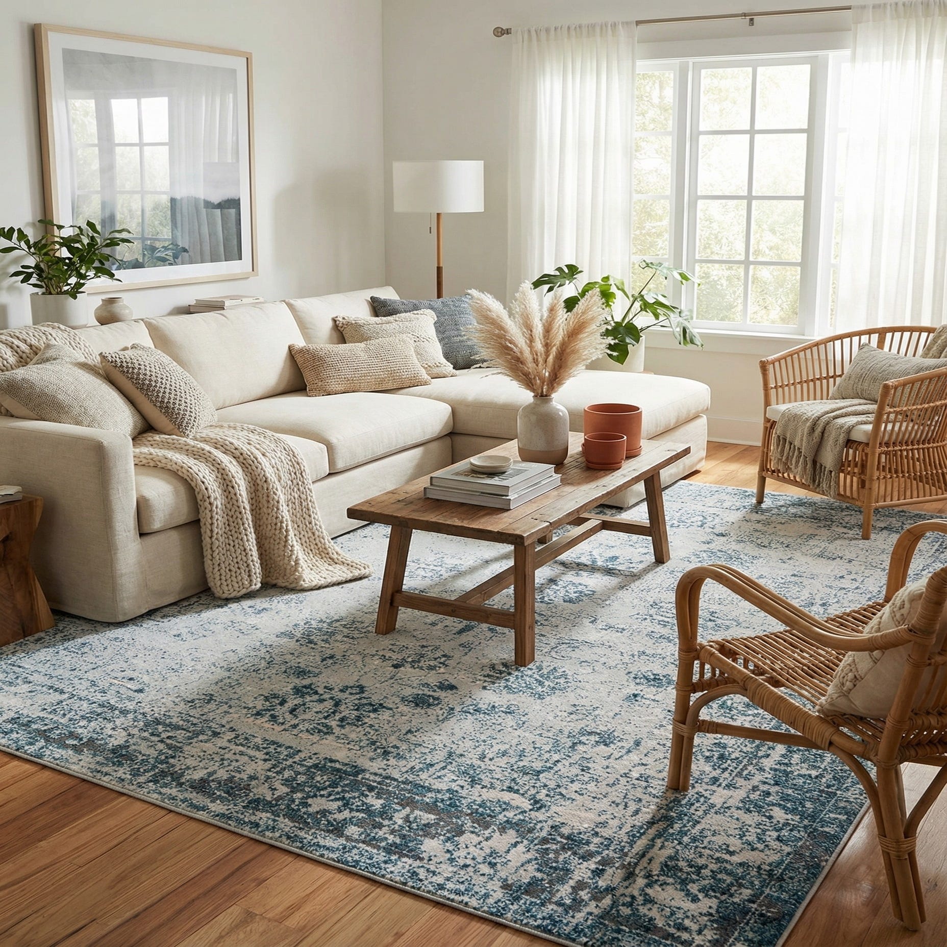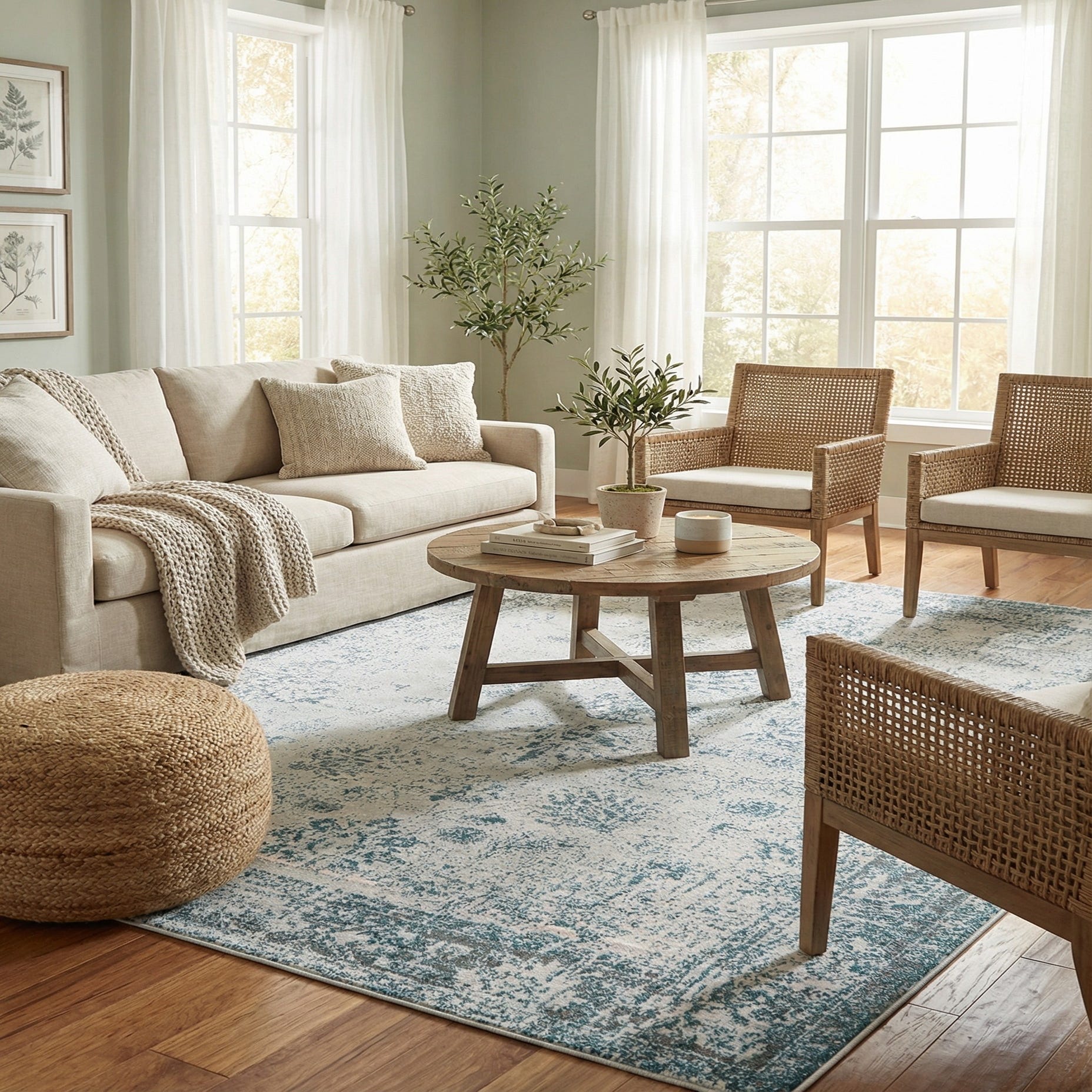 This rug works well in coastal and transitional interiors where a light, airy palette is desired—place it beneath a white linen sofa and a natural wood coffee table for a relaxed living room, or use it to soften hardwood floors in a bedroom layered with neutral bedding and textured throws. It also pairs nicely with navy or gray accent pieces in modern farmhouse or contemporary settings, and can anchor a dining area when you want pattern that’s understated rather than bold.