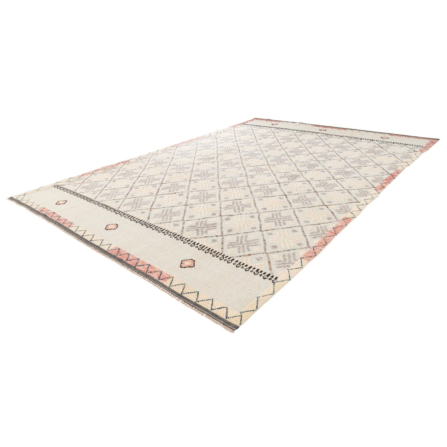 The muted palette and clean geometric pattern work well in a Scandinavian or coastal living room with pale wood and linen upholstery, or in a bedroom layered with blush accents and soft neutrals. It also pairs nicely with a modern-boho or transitional dining area where you want pattern and color without overpowering the space.