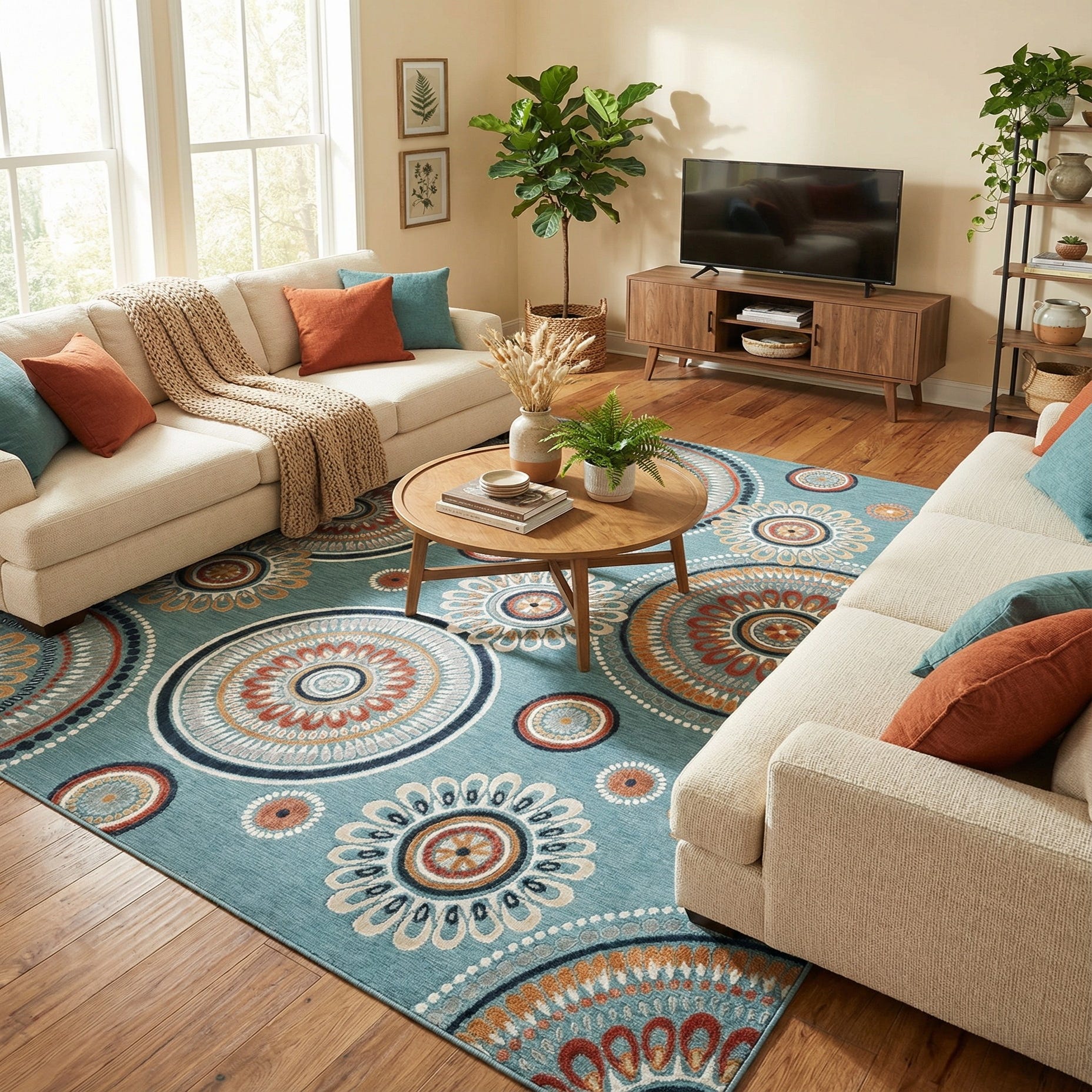 This versatile design works well on a covered patio or sunroom when paired with rattan seating and linen cushions, and it complements casual coastal or contemporary interiors with whitewashed wood and navy accents. It also anchors a family room or breakfast nook, pairing nicely with neutral sofas, light wood tables, or mid-century modern furnishings that pick up the rug’s blue and gold tones.