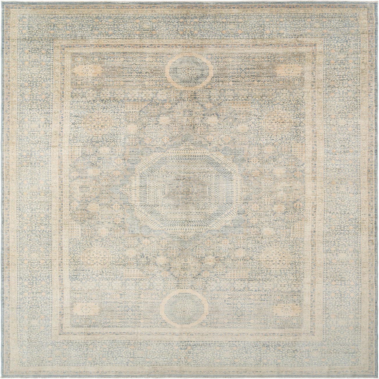 A rectangular handmade Persian rug in shades of light blue and cream, featuring intricate traditional patterns and a central medallion.
