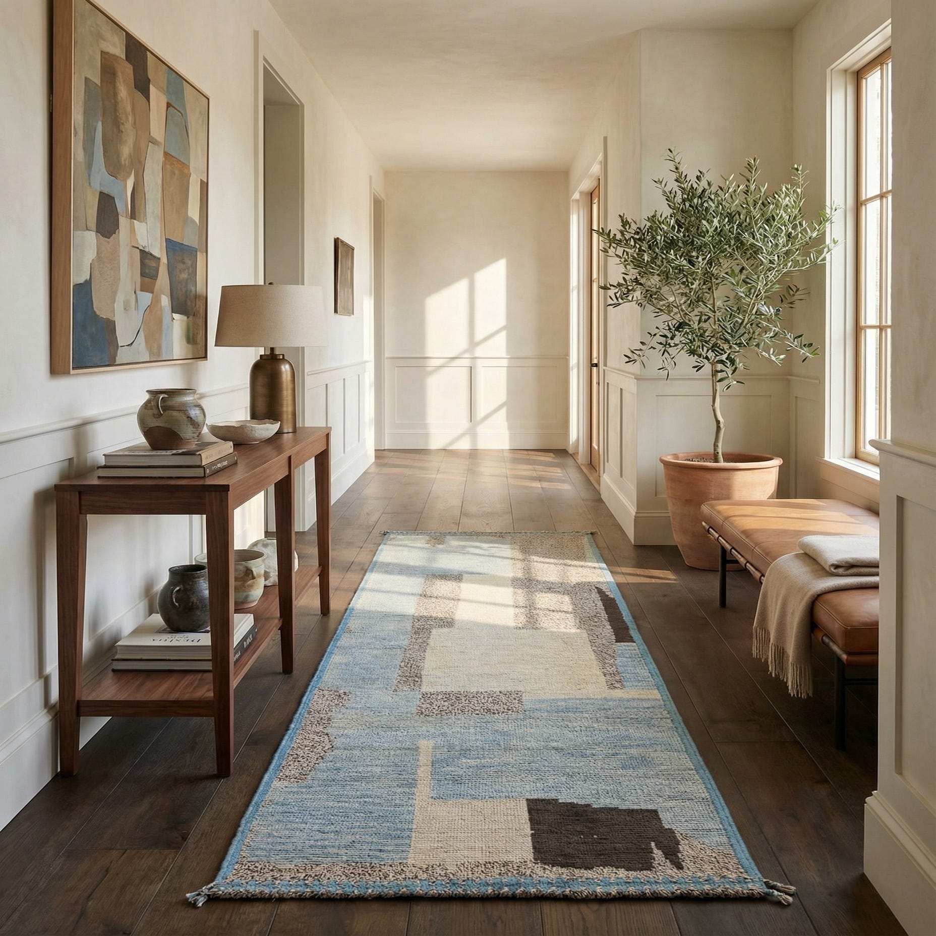 Primary color is Light Blue. Colors in this rug include: Light Blue, Runner.