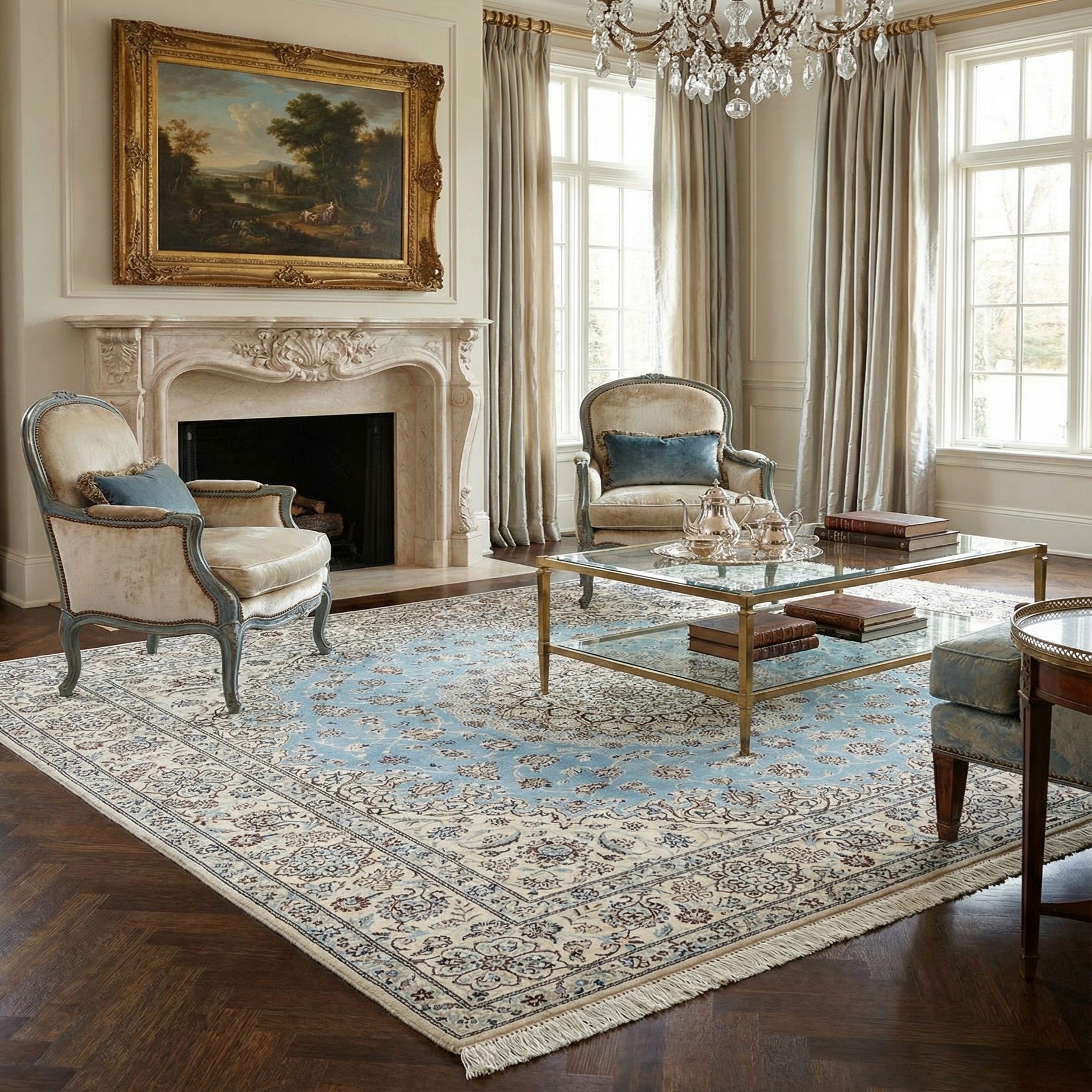 A handmade rectangular Persian rug featuring a light blue field with an intricate floral medallion and a cream border.