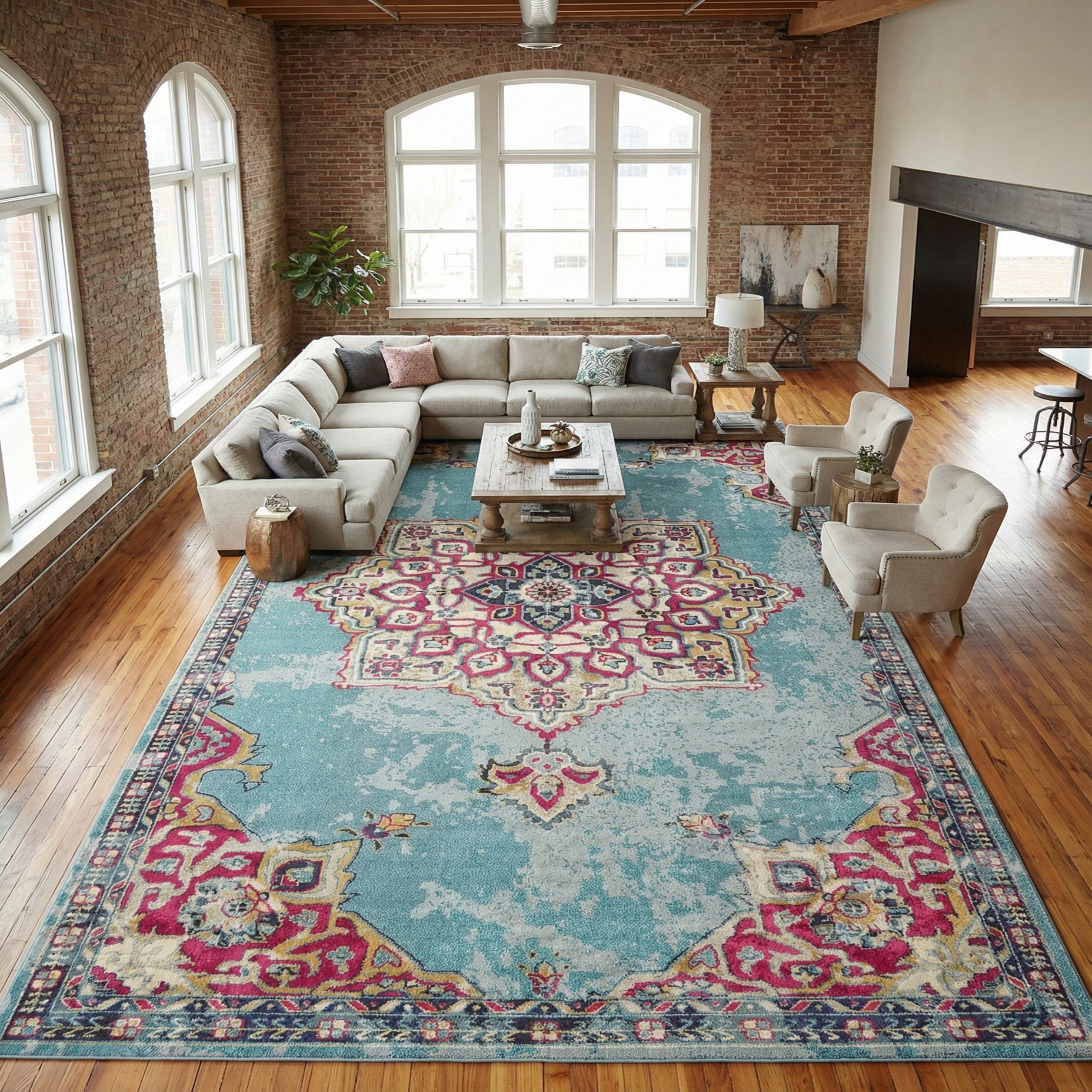 This rug pairs well with both relaxed and layered interiors — try it beneath a mid-century sofa to introduce color without overwhelming the room, or place it under a natural wood dining table to add visual interest to everyday meals. It also works in a bedroom with neutral linens and complementary accent pillows in coral or deep navy, or in an eclectic sitting area where mixed patterns and warm metals are used. The combination of traditional motifs and contemporary colors makes it an easy anchor for transitional, bohemian, or cottage-inspired schemes.