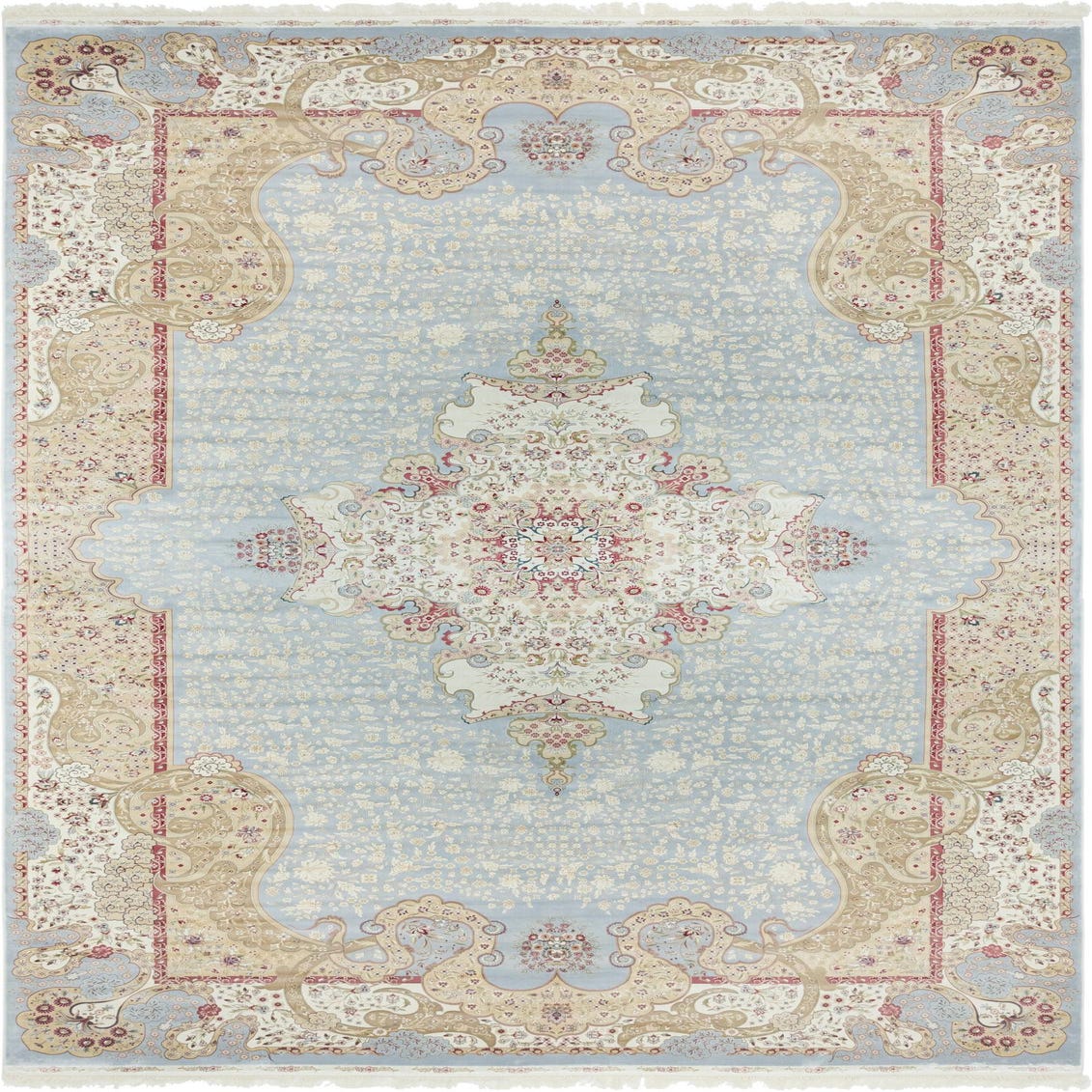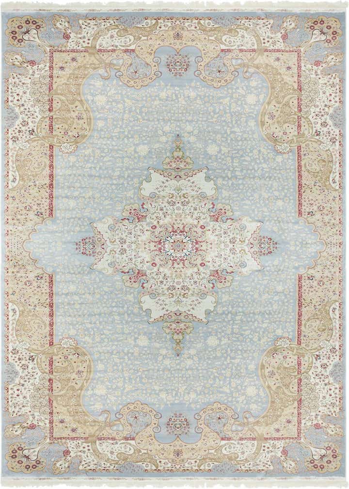 Primary color is Light Blue. Colors in this rug include: Light Blue, Beige, Green, Ivory, Light Green, Red, Pink.