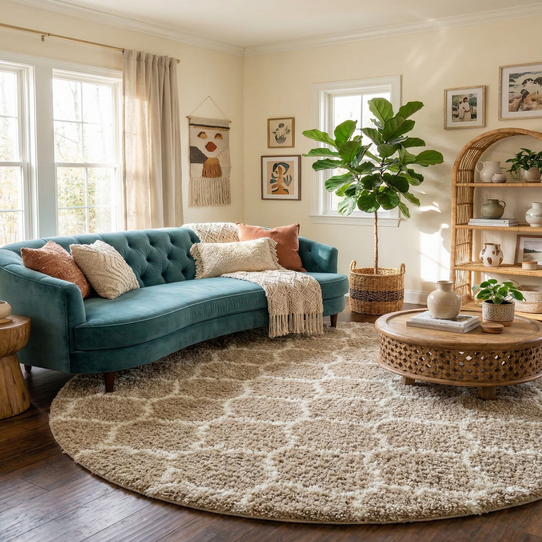This circular rug works well layered beneath a round dining table or placed in a living room to anchor a seating group, and it also adds warmth to a bedroom sitting area or casual entry. Pair it with warm wood tones, linen upholstery, or leather sofas for a cozy, lived-in look; it complements transitional, modern farmhouse, and coastal-inspired interiors that favor neutral colors and tactile texture.