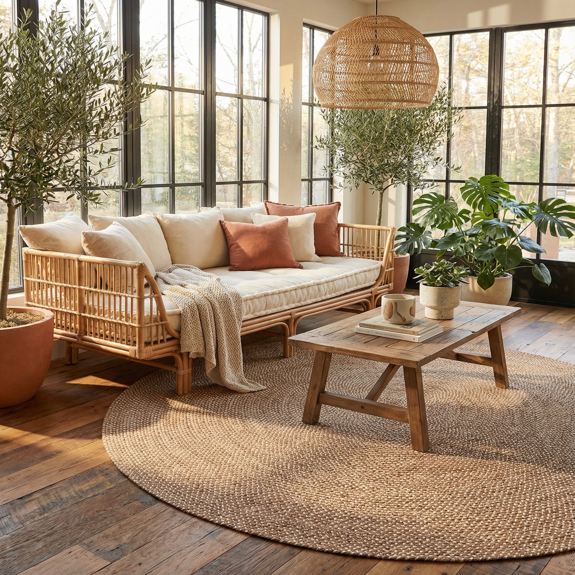 Place it under a round dining table or anchor a cozy seating area; its organic tones pair naturally with weathered wood, rattan, leather, and linen upholstery. It works well in casual living rooms, entryways, sunrooms, or a covered patio and complements coastal, farmhouse, Scandinavian, and relaxed contemporary interiors where layered texture and natural materials are key.