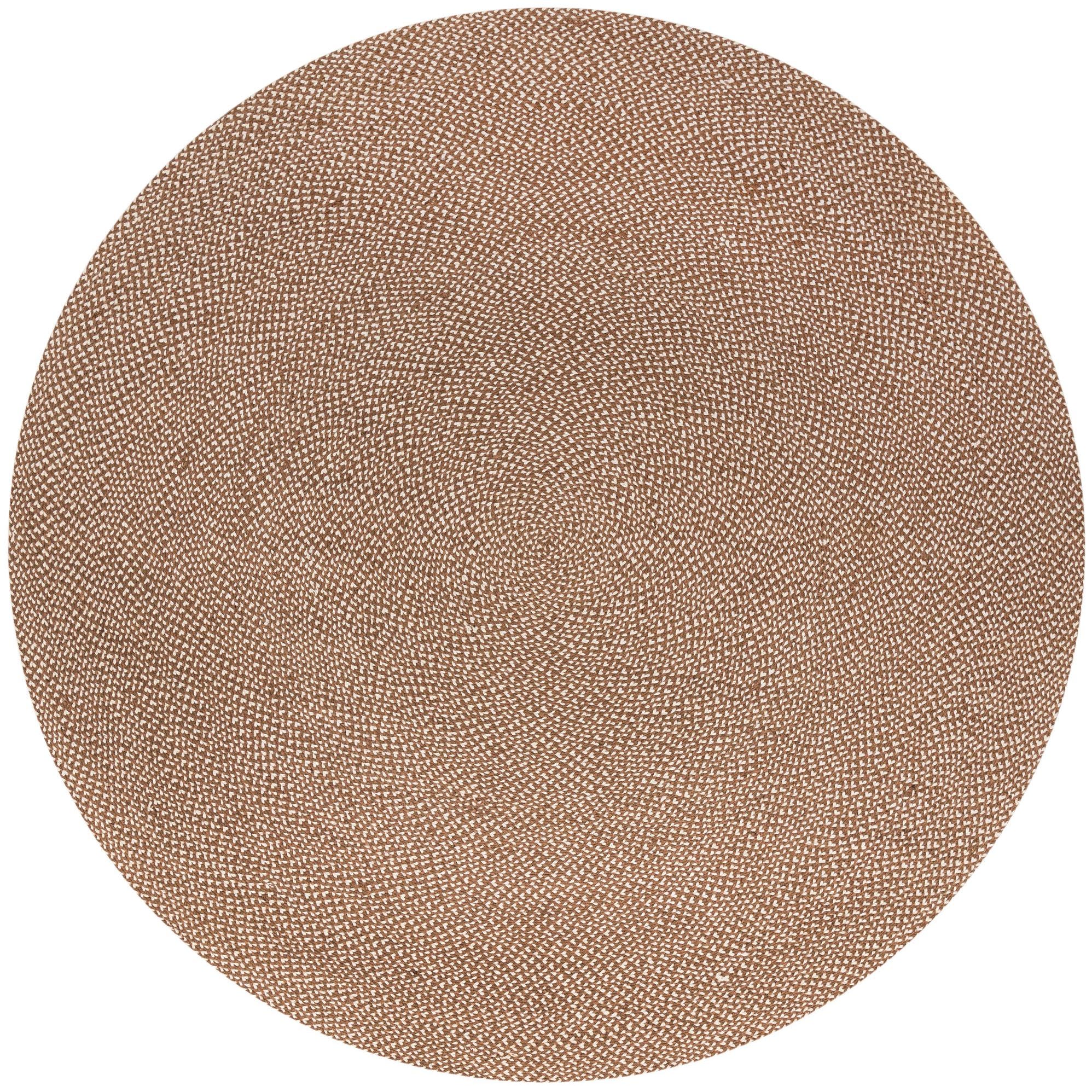 Hand-braided from 100% jute, this round rug presents a tight, concentric braided pattern in a warm light brown ground threaded with ivory flecks for a subtle tweed effect. The low-profile surface has the natural, slightly coarse texture of jute that gives it good structure underfoot while still feeling grounded and approachable. The braided spiral creates gentle visual movement without a strong motif, making the piece quietly versatile.