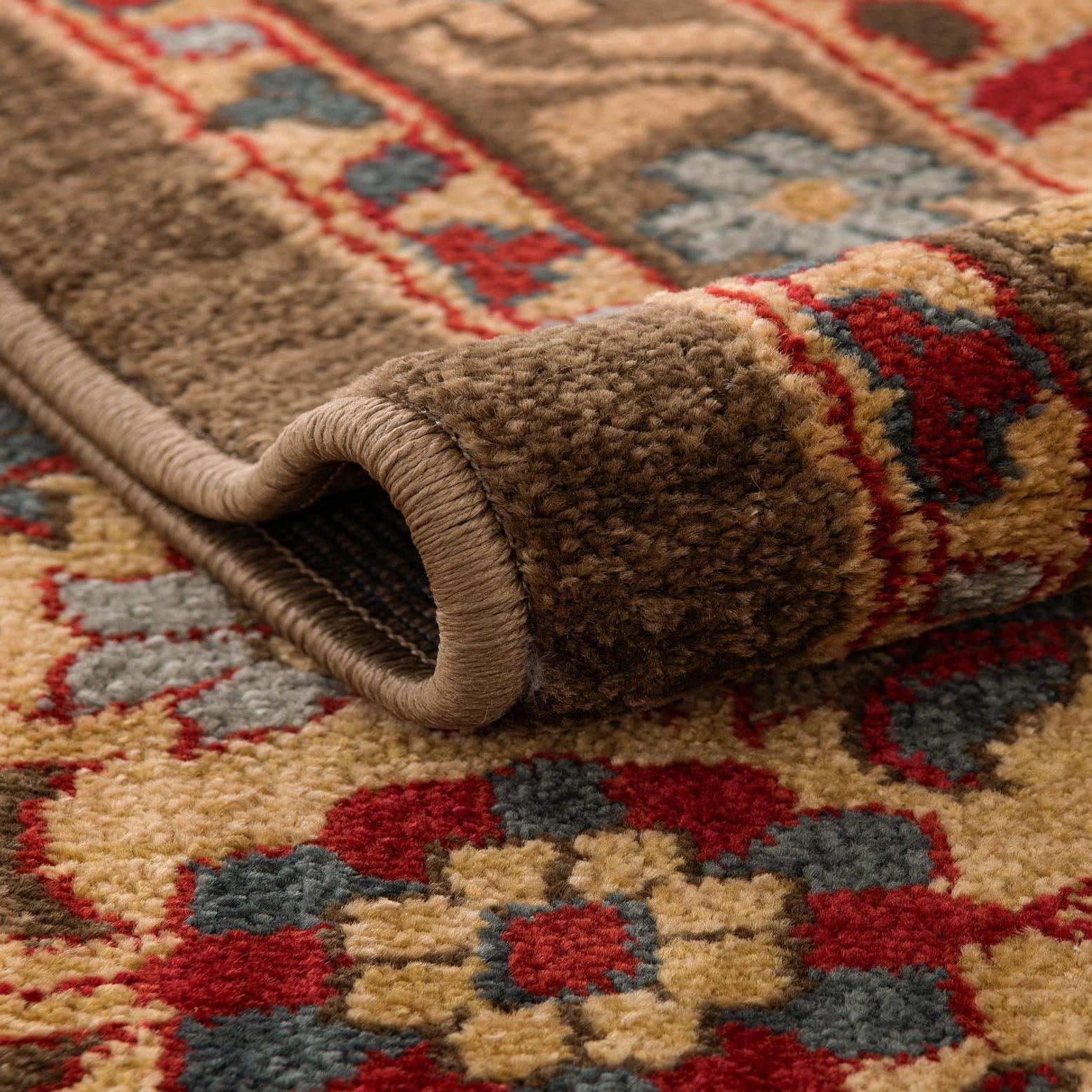 Primary color is Light Brown. Colors in this rug include: Light Brown, Beige, Blue, Cream, Light Blue, Olive, Brown, Navy Blue.