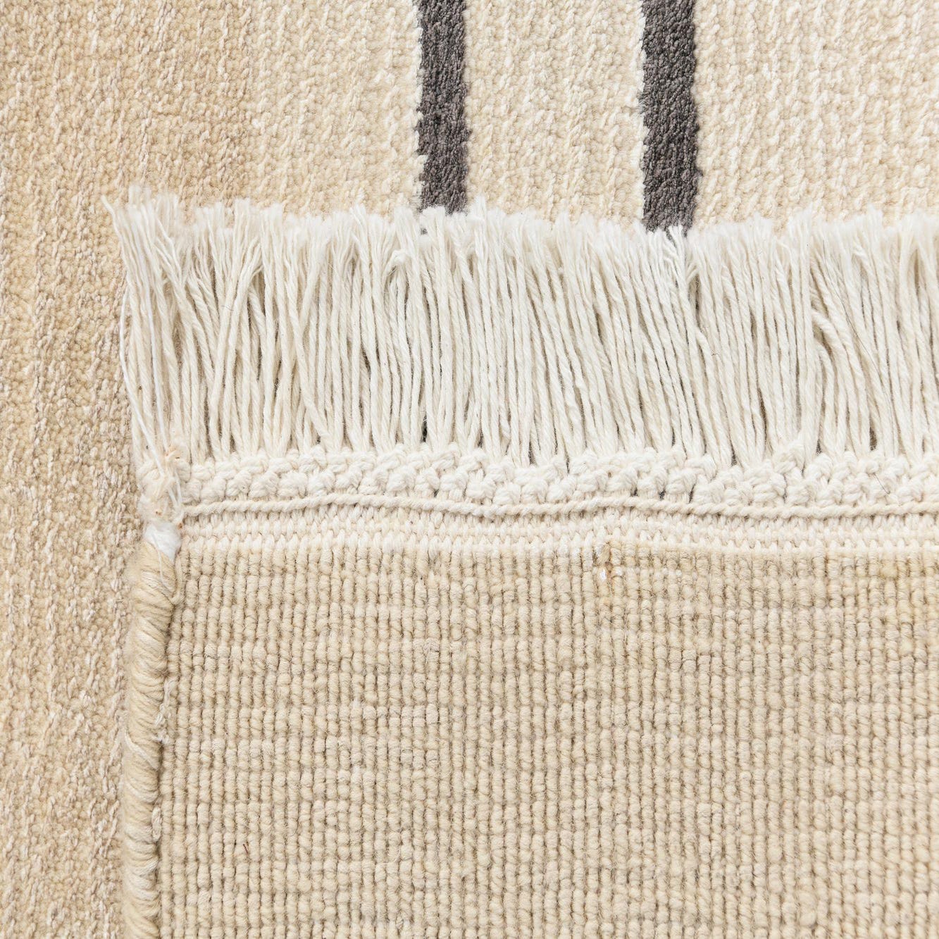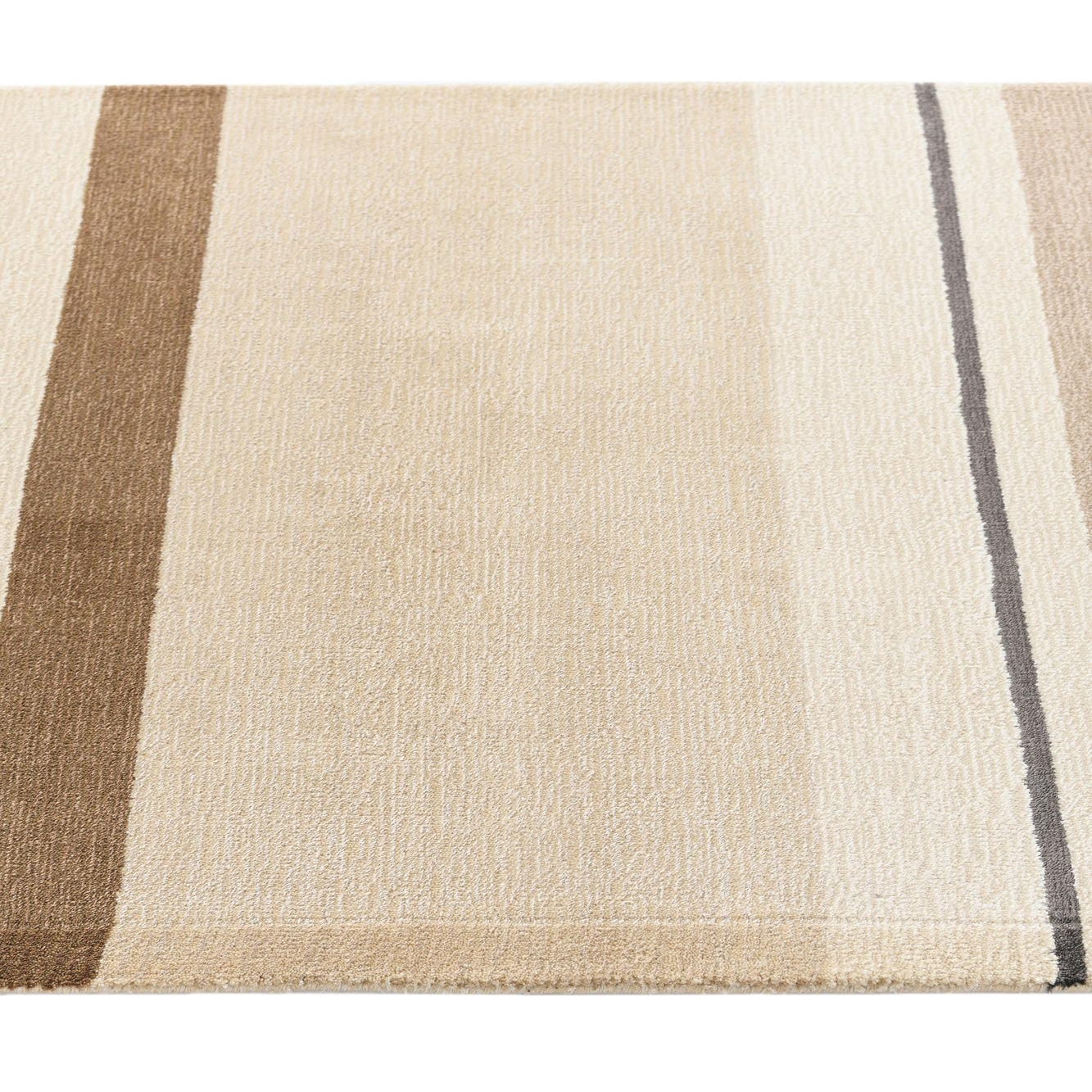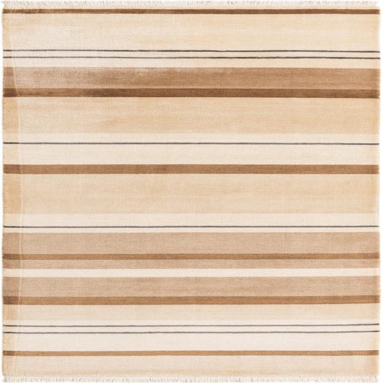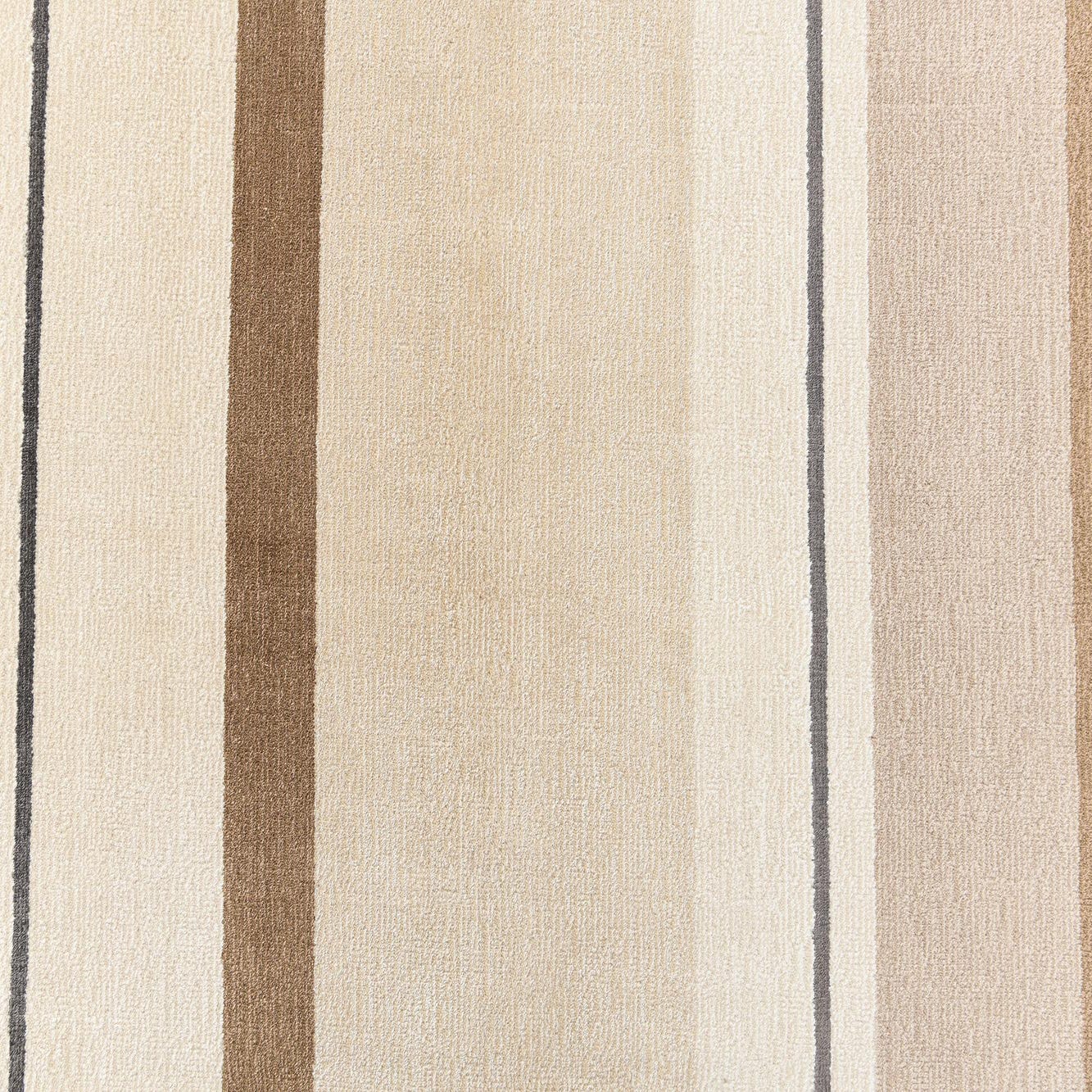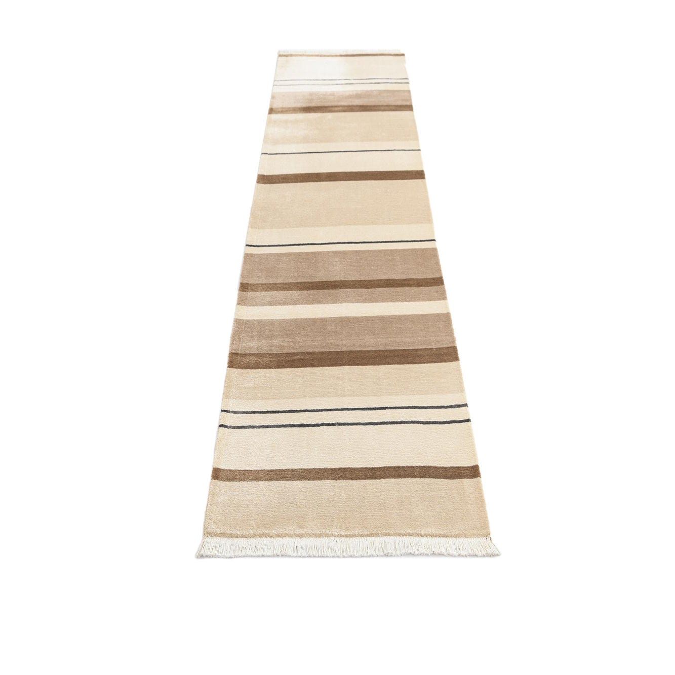 A 10 ft Darya runner rug with varying shades of brown and tan stripes, featuring a high pile and fringe.
