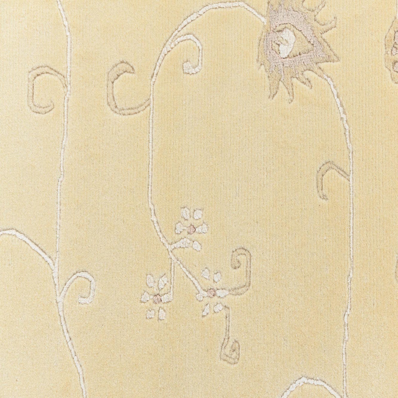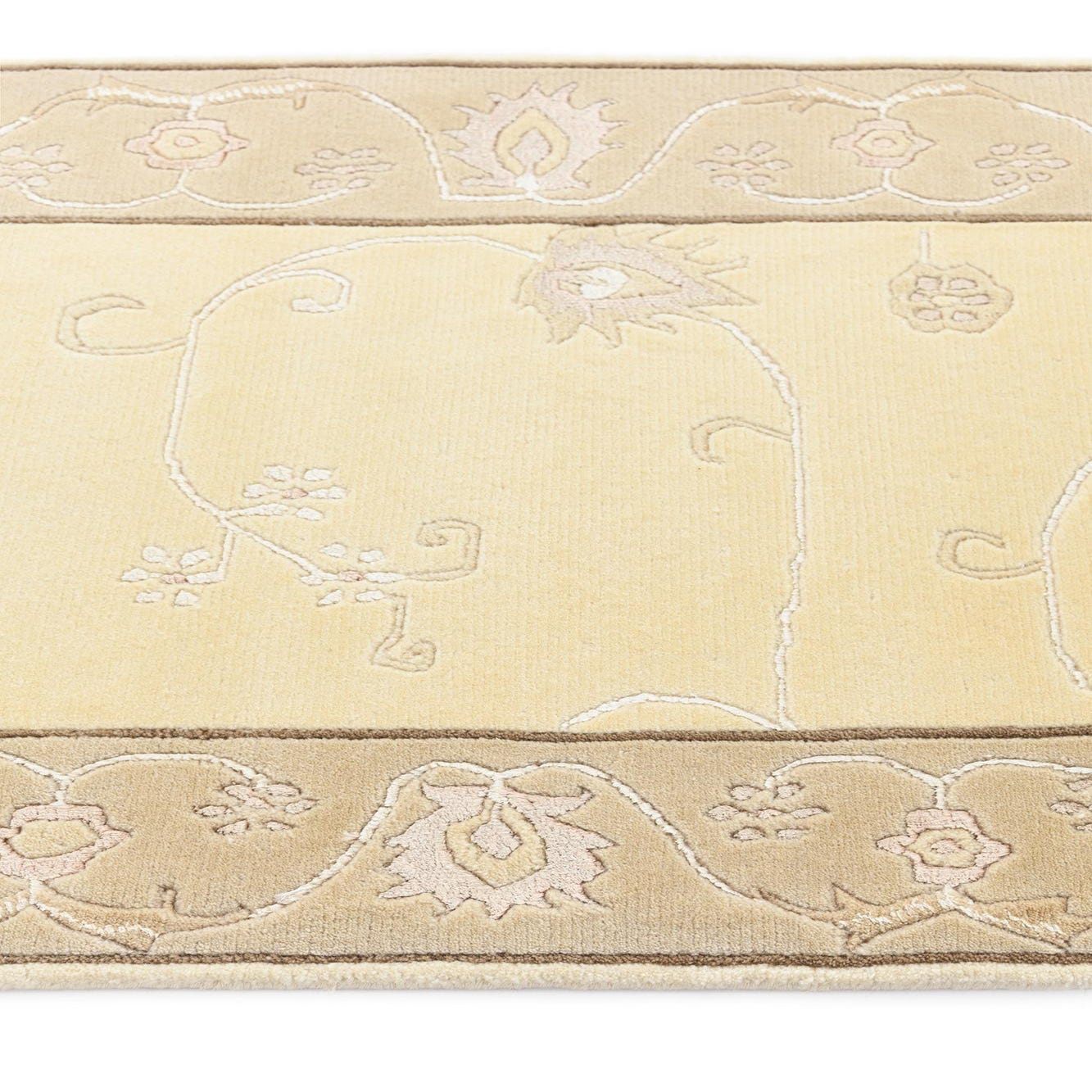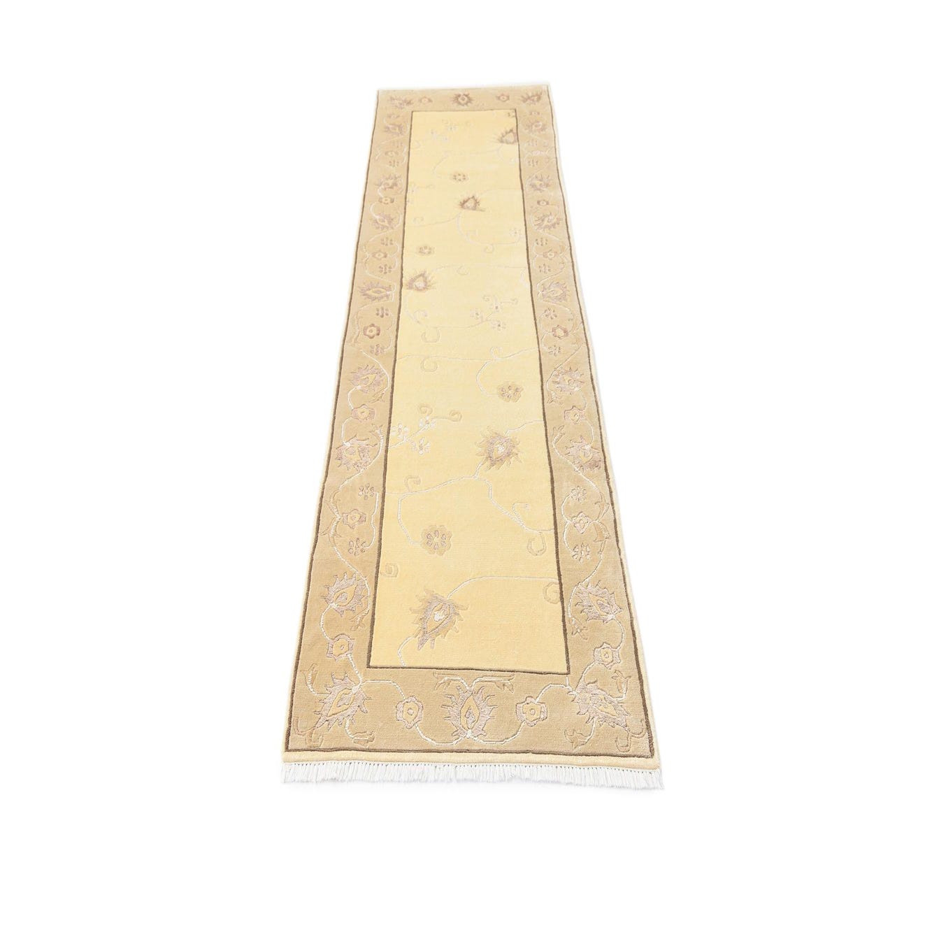 The Darya collection runner rug is a handcrafted blend of wool and cotton, ensuring durability with a soft touch. This 10 Ft runner showcases a light brown background, complemented by tones of beige, brown, gold, and tan, which collectively create an inviting and warm palette. The pattern features an elegant traditional floral design with botanical motifs gracefully distributed along the borders and the field of the rug, providing a sense of symmetry and visual harmony.