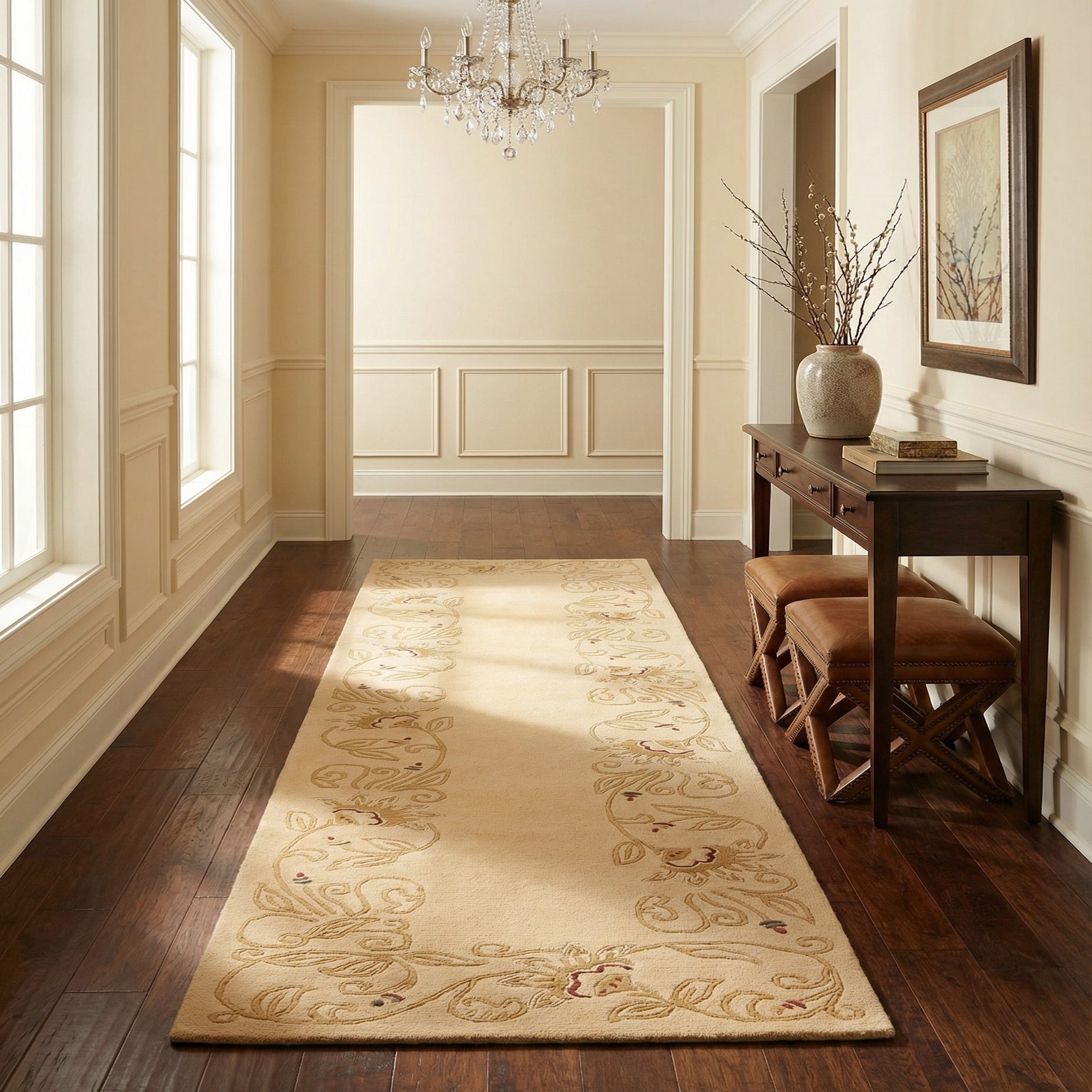 A 10 ft Darya runner rug in brown and tan, featuring a modern Persian floral border on a high pile.