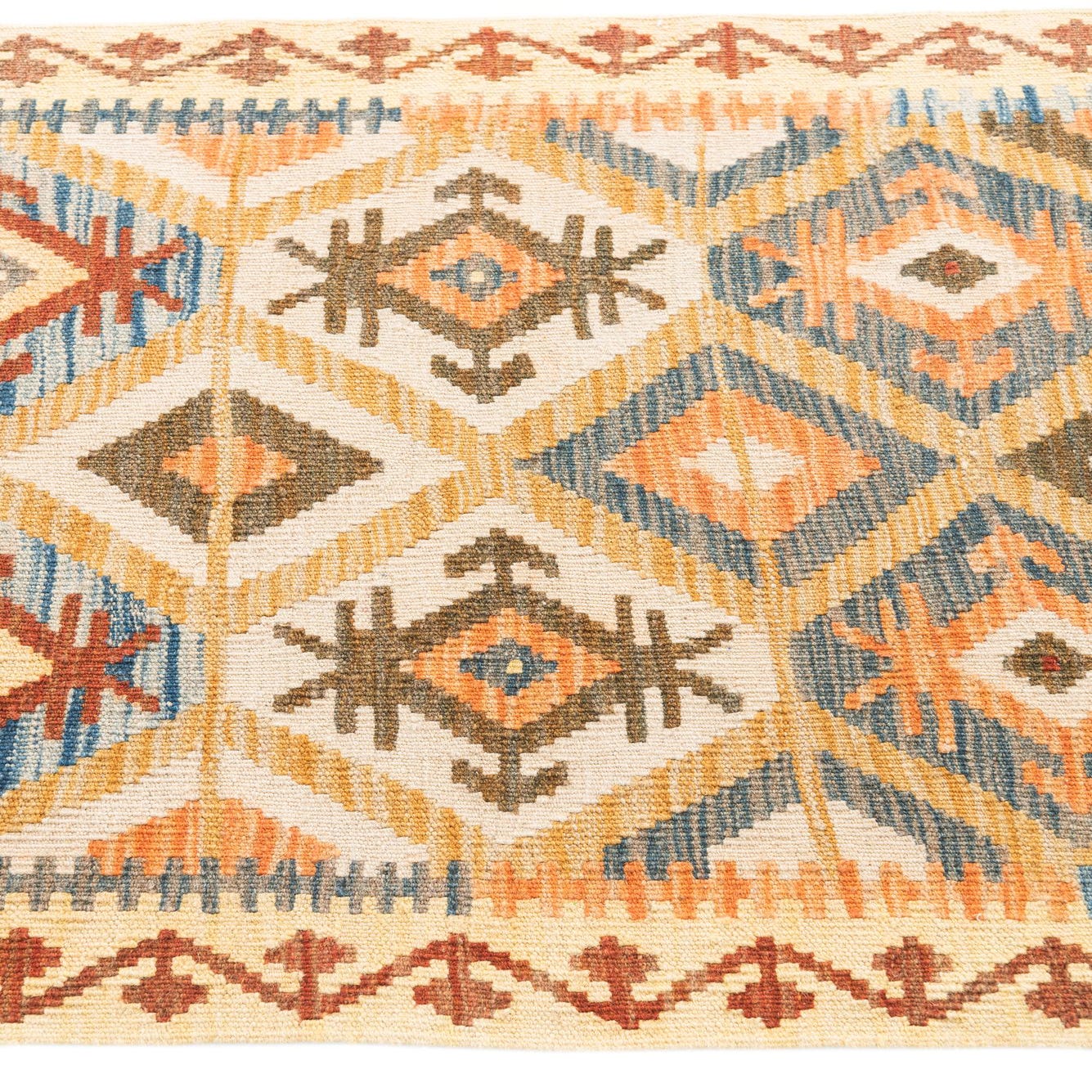 The Kilim Maymana collection presents a 10 Ft Runner rug, handwoven with 100% wool, showcasing a robust construction with a flatweave texture that adds a touch of artisanal charm to any space. This runner features a geometric pattern with a symmetrical arrangement of diamond shapes and complementary motifs that give it a dynamic and structured aesthetic. The pattern is rendered in a warm and earthy palette, consisting of light brown, beige, blue, brown, yellow, olive, orange, and navy blue, set against a light brown background which acts as a neutral base allowing for versatility in styling.