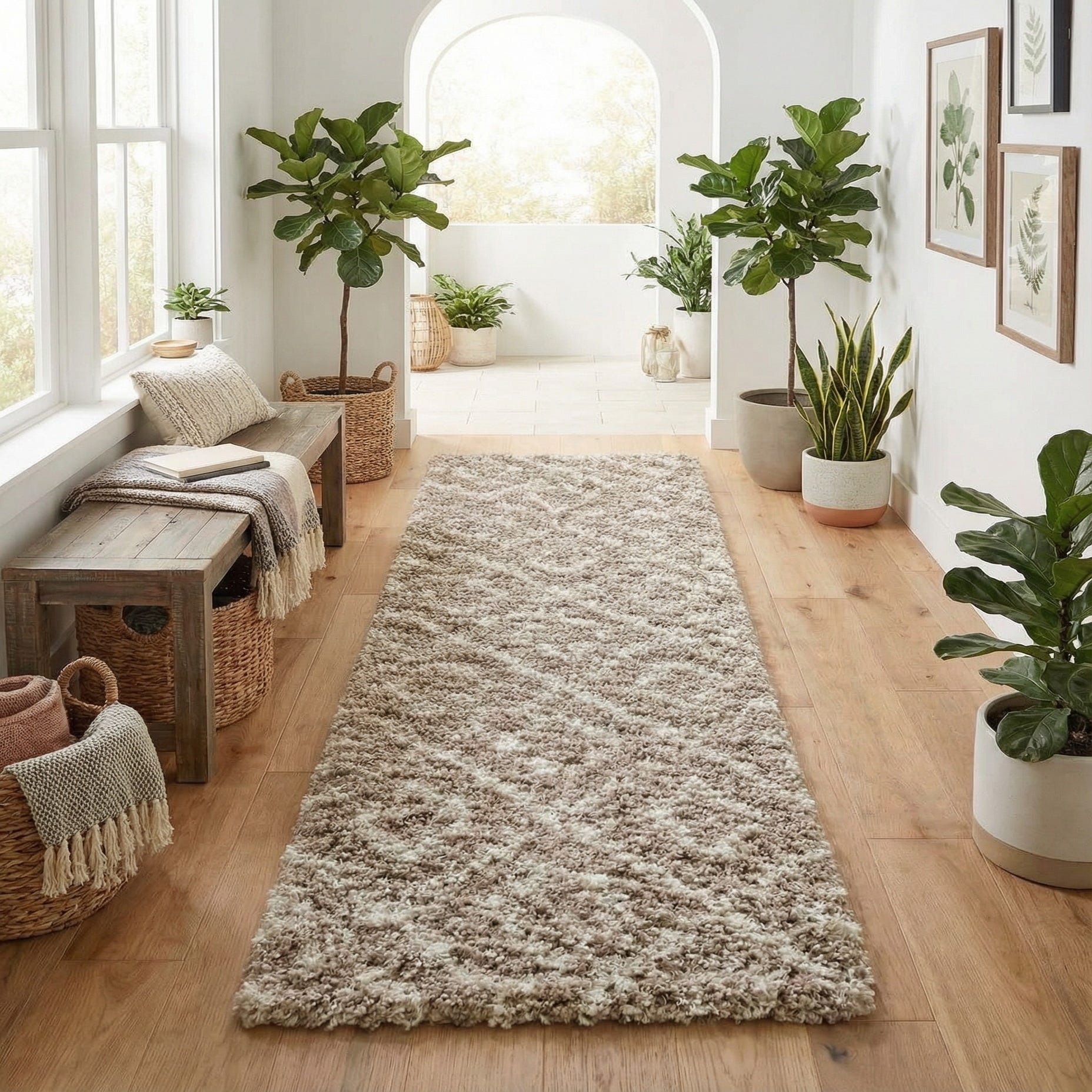 This runner works well in hallways, entryways, or alongside a bed to add warmth and a soft landing underfoot. Pair it with natural wood furniture and neutral upholstery for a calm, layered look, or use it to soften contemporary and transitional spaces where a muted geometric pattern complements clean lines. The light brown and ivory palette integrates easily with warm metals, woven accents, and linen fabrics to create a relaxed, inviting atmosphere.