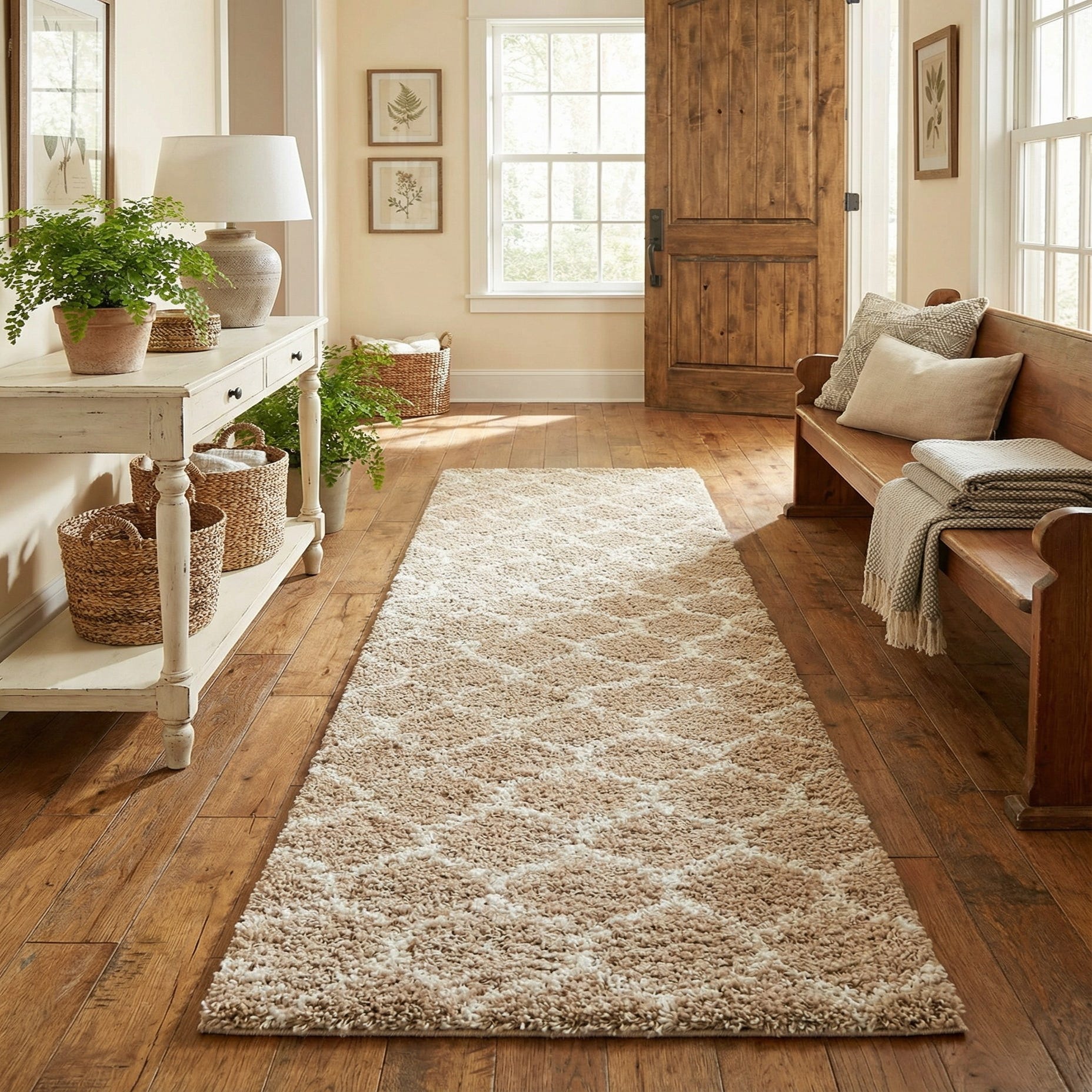 A warm light brown field is crossed by an ivory lattice pattern, giving this shag runner a clean, geometric look with a soft, tactile finish. The high-pile polypropylene fibers create a plush surface that cushions each step and adds visual depth as the ivory lines gently contrast with the background. The overall effect is relaxed and tailored, with the shag texture bringing a cozy, lived-in feel.