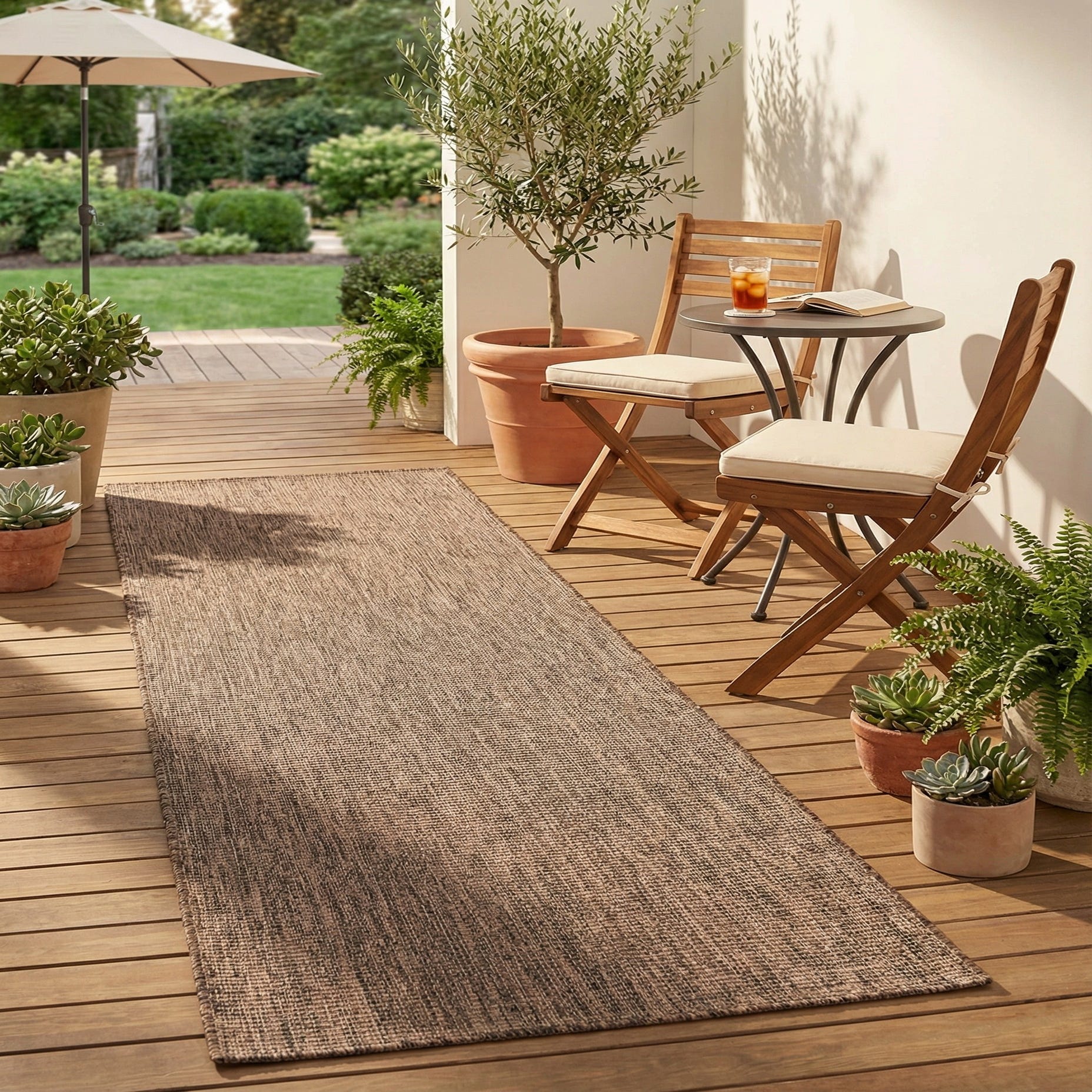 From our Outdoor Solid collection, this 10 Ft runner rug offers a harmonious blend of light brown and beige, set against a predominantly light brown background for a versatile and sophisticated look. The rug presents a simple yet compelling pattern that transcends seasonal trends, making it a timeless addition to any space.