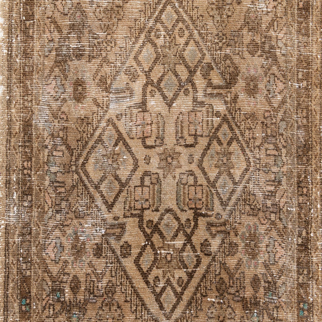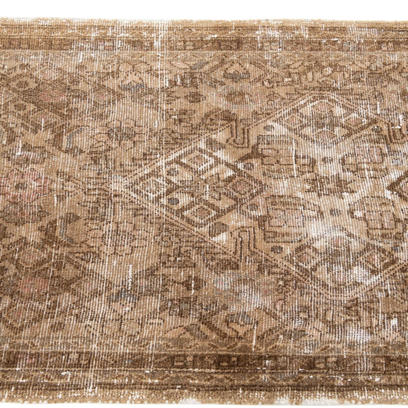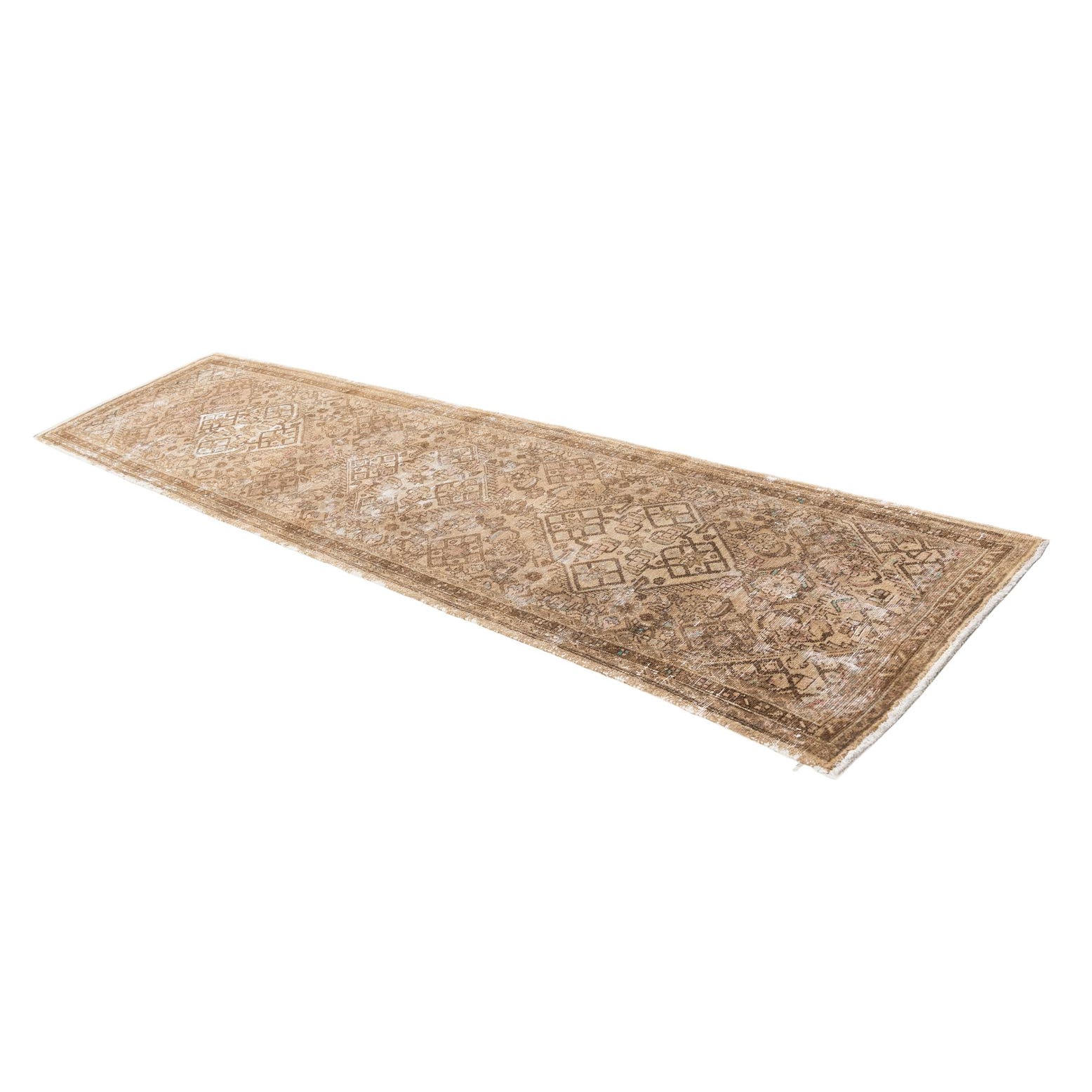 A 10 ft runner rug in shades of brown and tan, featuring a distressed Persian medallion pattern, ideal for a hallway.