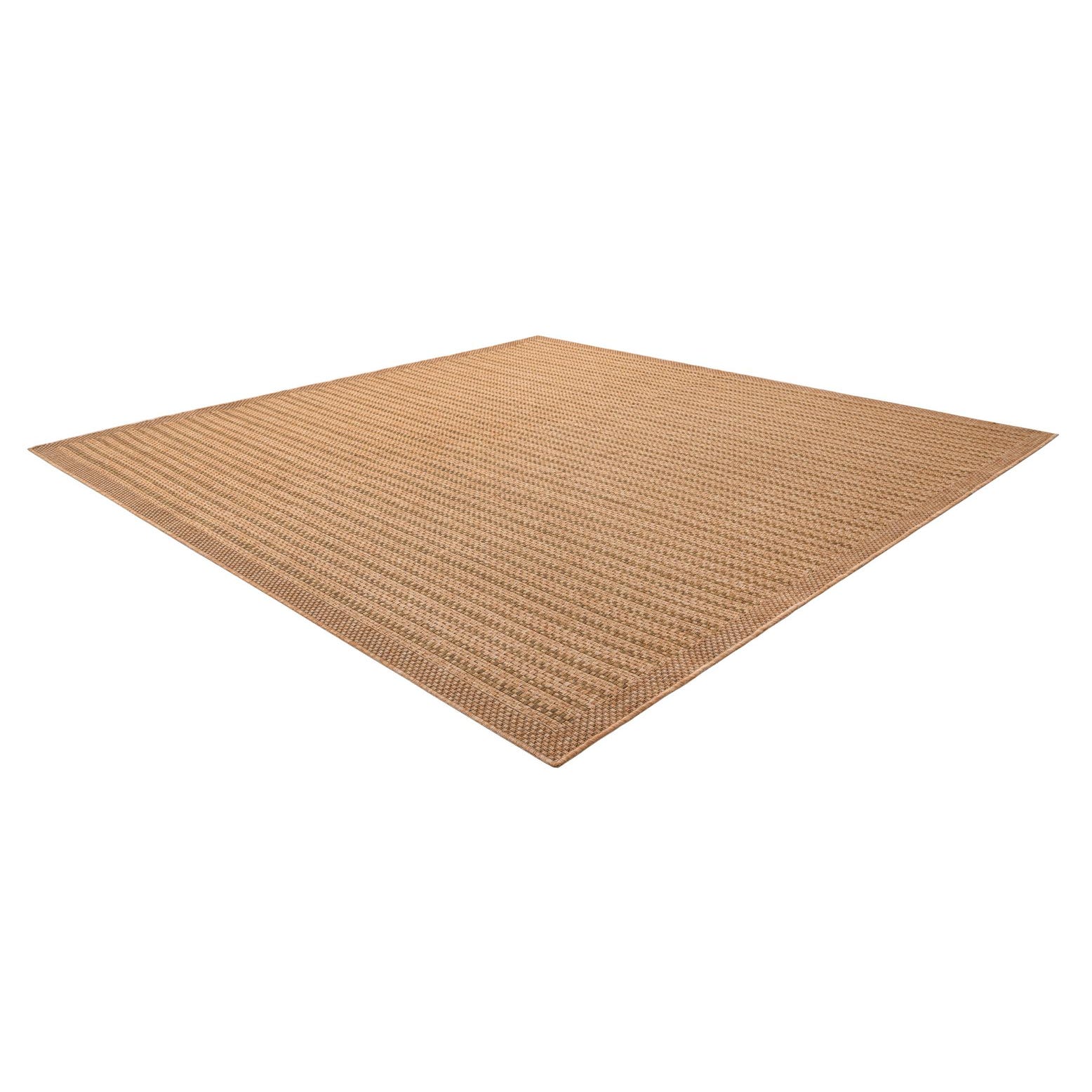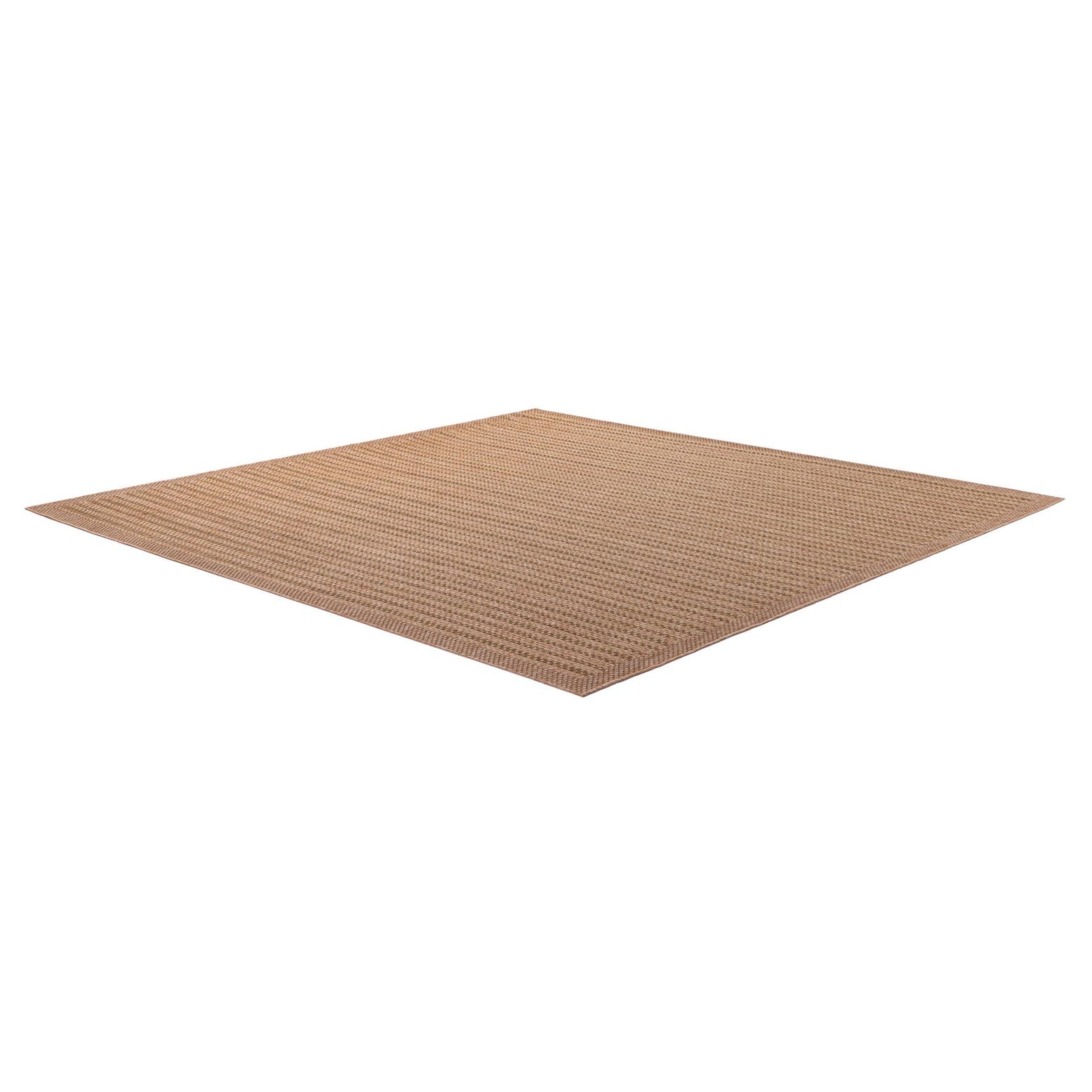 A 10'x10' square brown flatweave rug with a subtle textured stripe pattern and a border, suitable for indoor or outdoor use.
