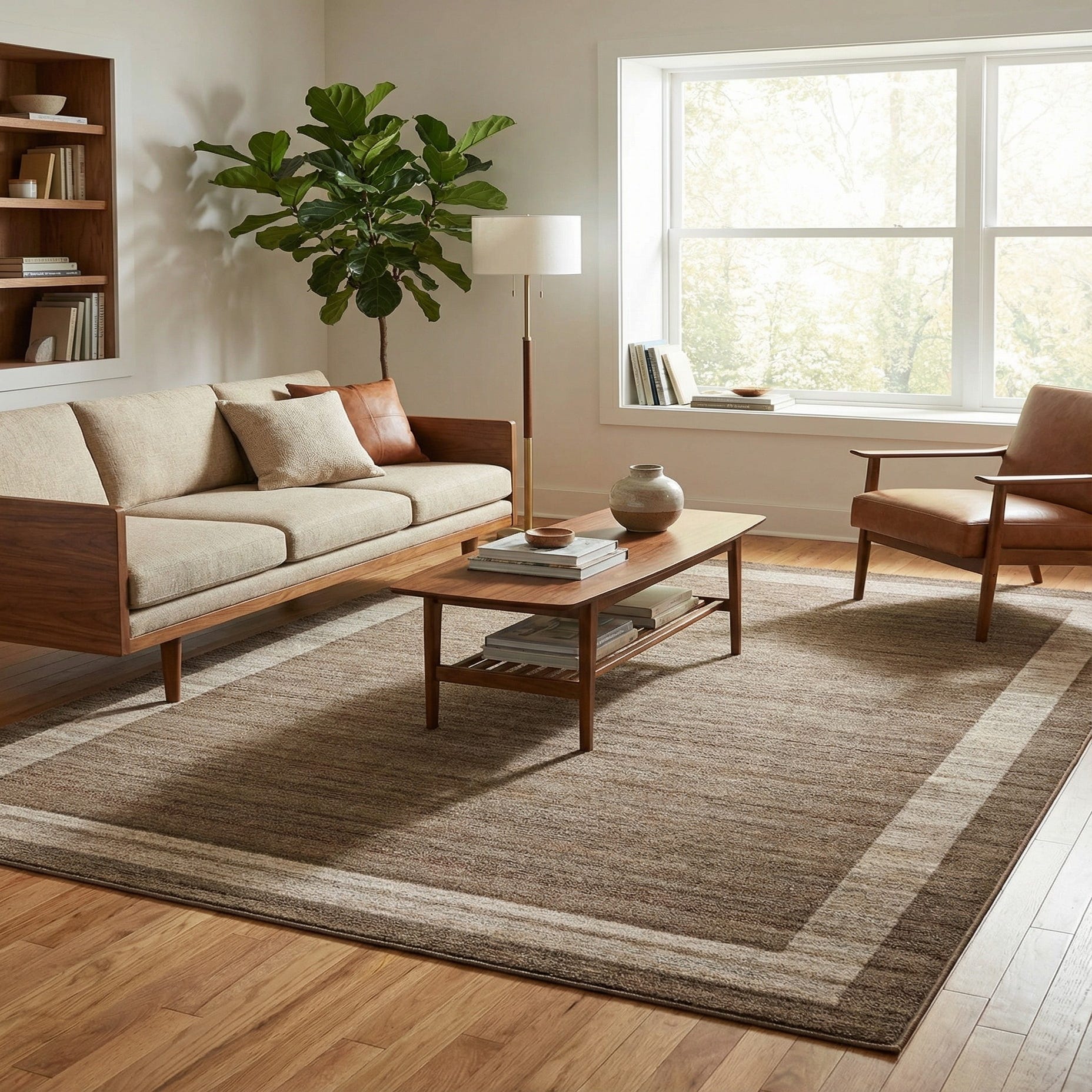 A 10x13 rectangular brown area rug with a subtle tan border, perfect for a contemporary living room.