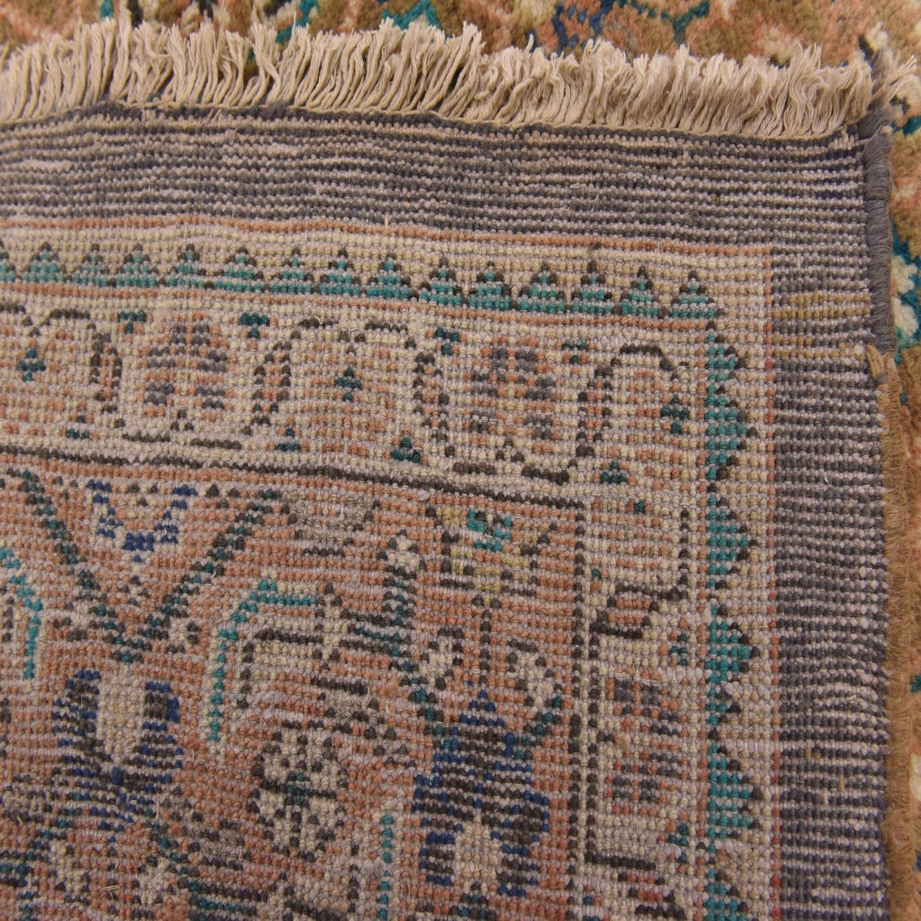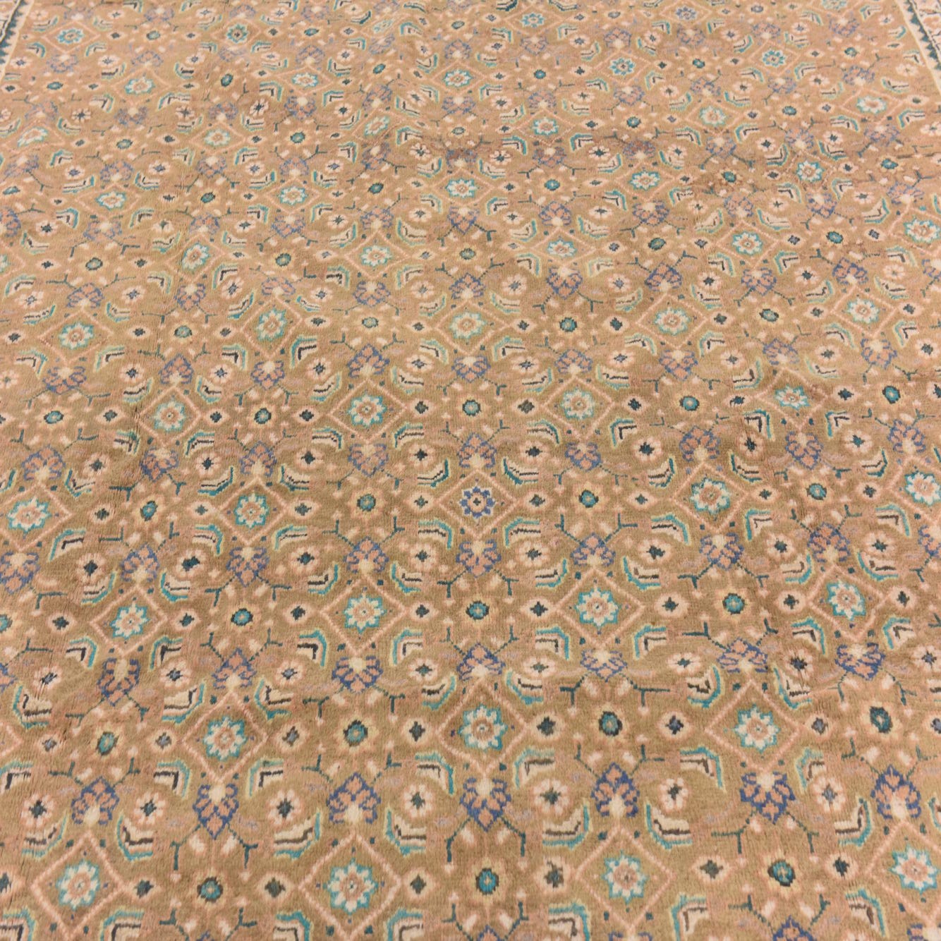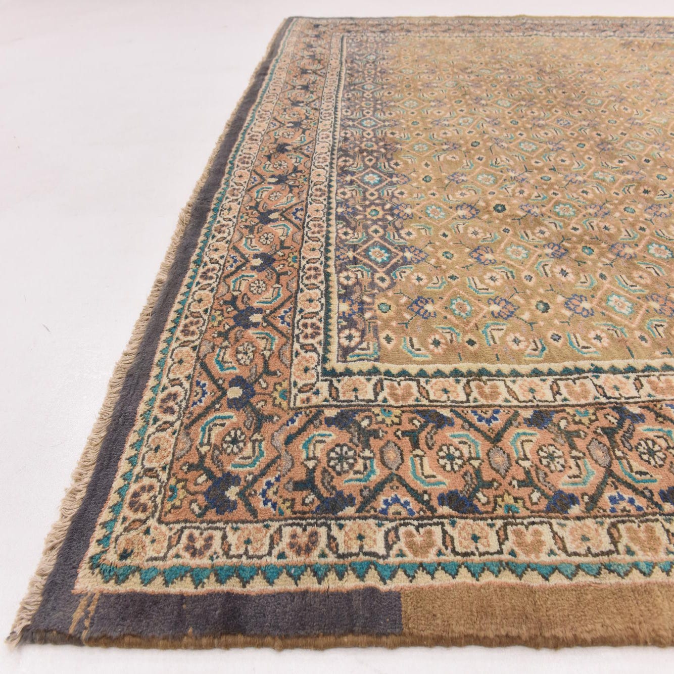 The Farahan Collection offers a 10x13 hand-knotted rug crafted from 100% wool, presenting a delightful balance of traditional design and a harmonious color palette. This semi-antique piece showcases a light brown background accented by an array of colors including blue, cream, hunter green, navy blue, teal, and peach, lending both versatility and warmth to its aesthetic. The pattern features intricate geometric and floral motifs, densely arranged to create a sophisticated and timeless allure.