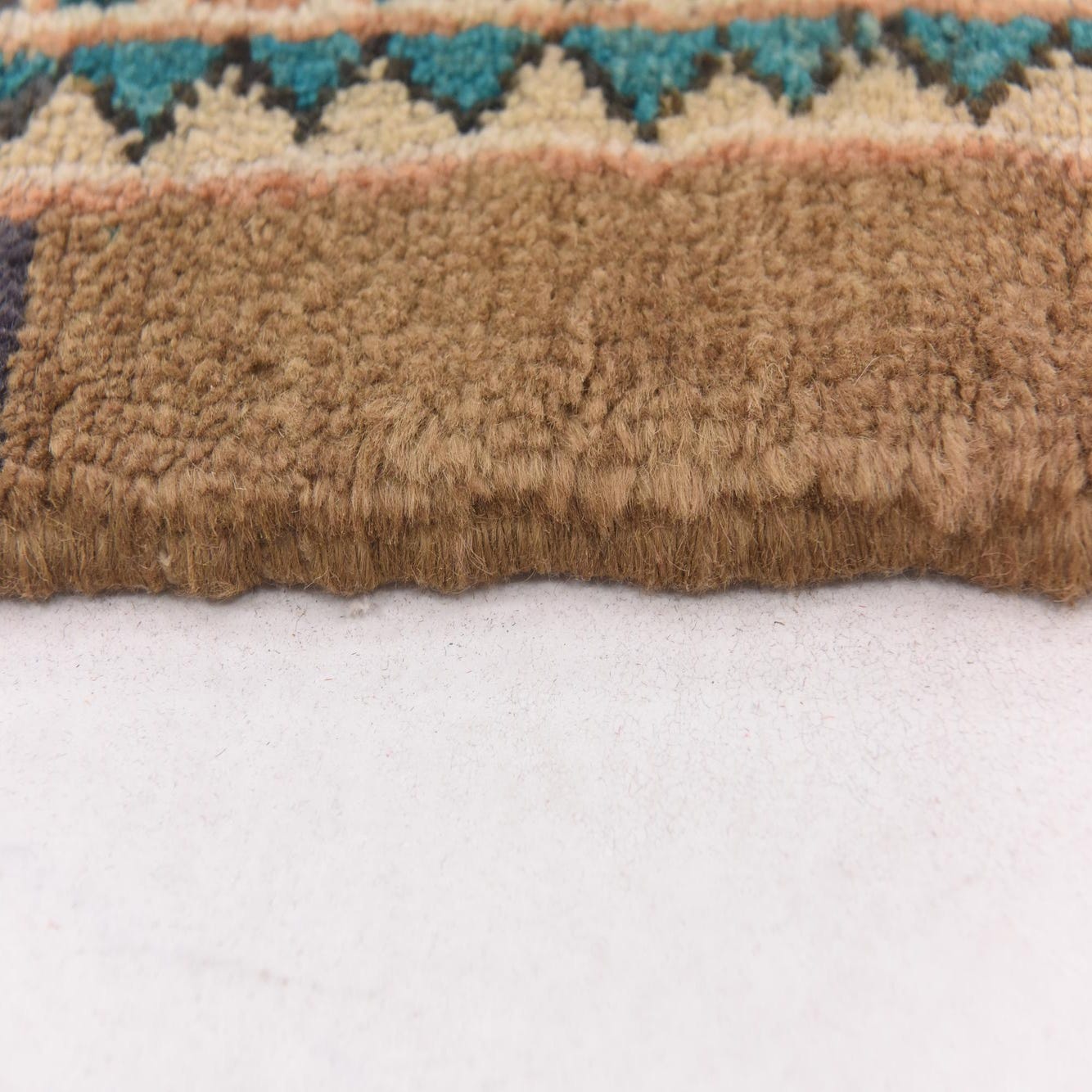 Primary color is Light Brown. Colors in this rug include: Light Brown, Blue, Cream, Hunter Green, Navy Blue, Teal, Peach.
