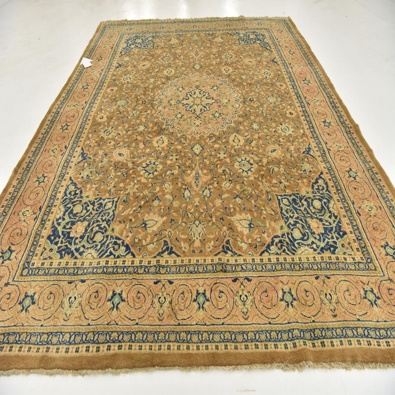 The Farahan collection presents a meticulously hand-knotted rug crafted from 100% wool, offering a natural resilience and comfortable texture underfoot. Measuring 10x13, this rug features a light brown background, elegantly complemented by a palette of beige, blue, brown, green, ivory, and navy blue. The design showcases a central medallion surrounded by intricate floral motifs and an ornate border, exhibiting the classic finesse of traditional Persian patterns.