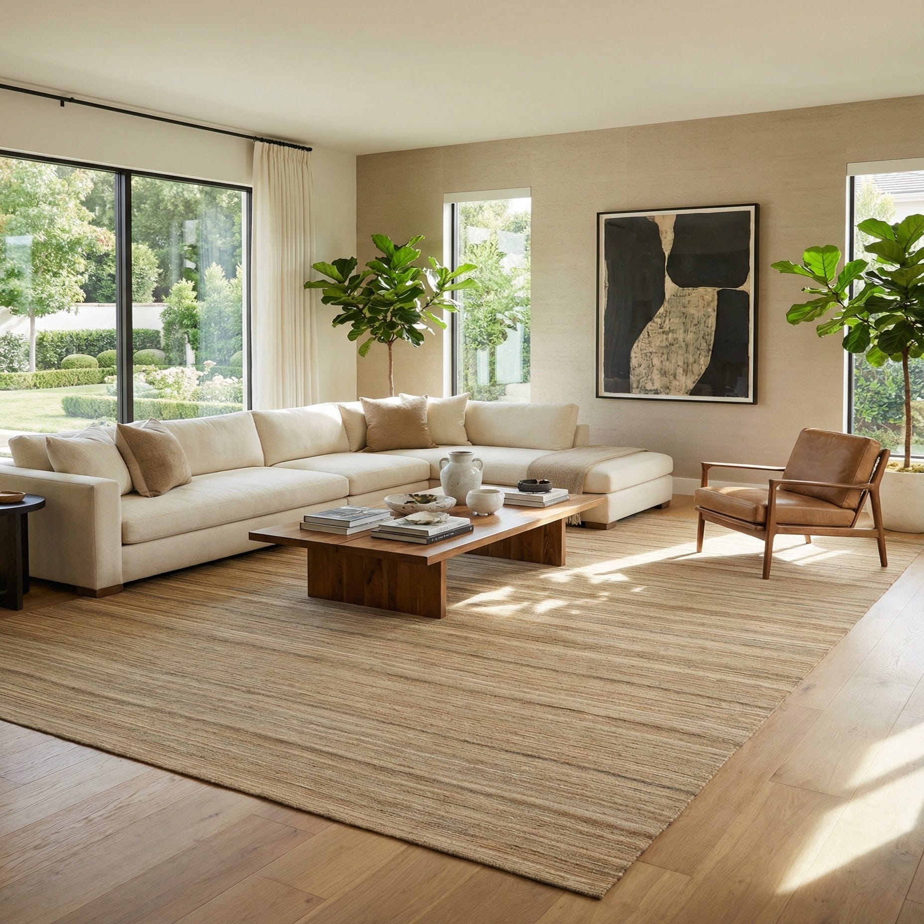 Given its texture and earthy color palette, this piece can effortlessly complement a range of decor styles, from minimalist and Scandinavian to more rustic and industrial spaces. The rug's linear pattern and refined color variation can help unite elements within a room, making it suitable for spacious living areas, open-concept homes, or as a grounding piece in an understatedly styled dining room. Its wool construction not only adds a layer of warmth but also brings a sense of sophistication and durability to the interior.