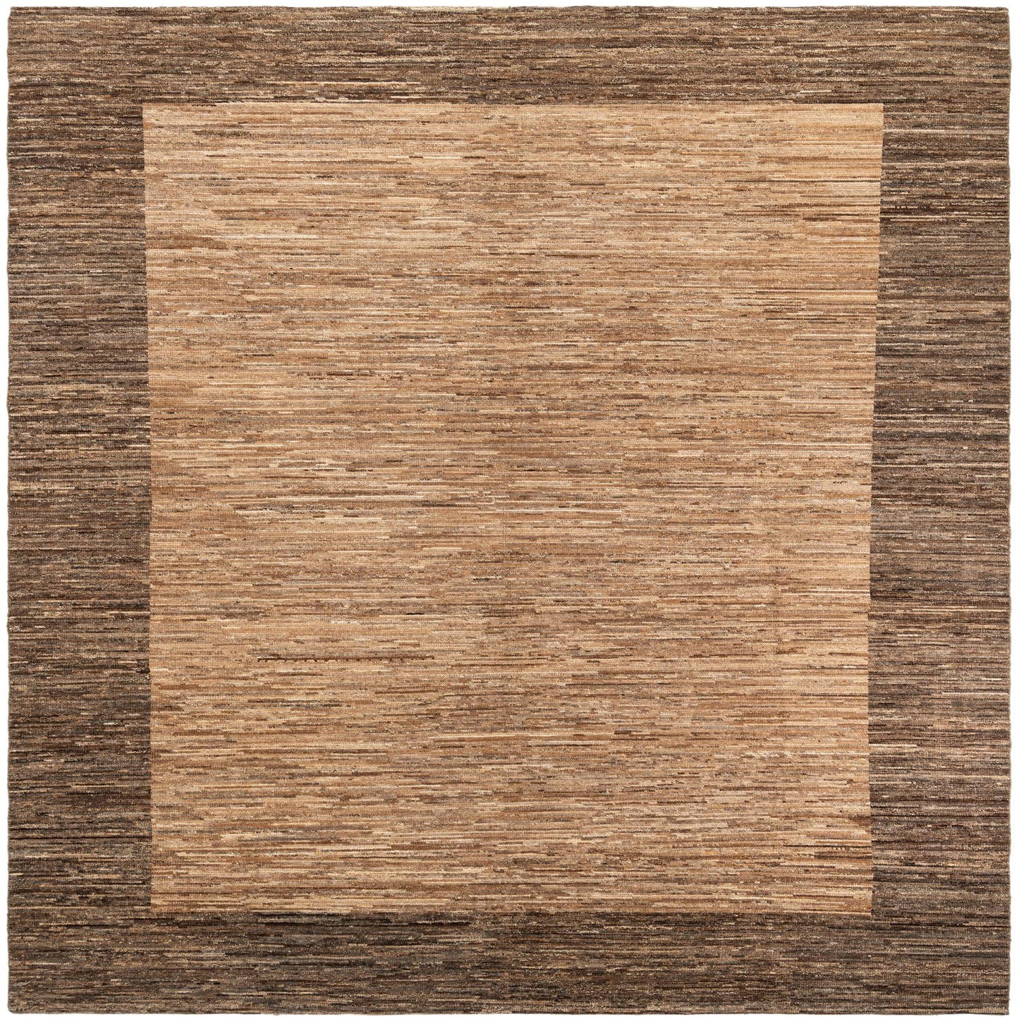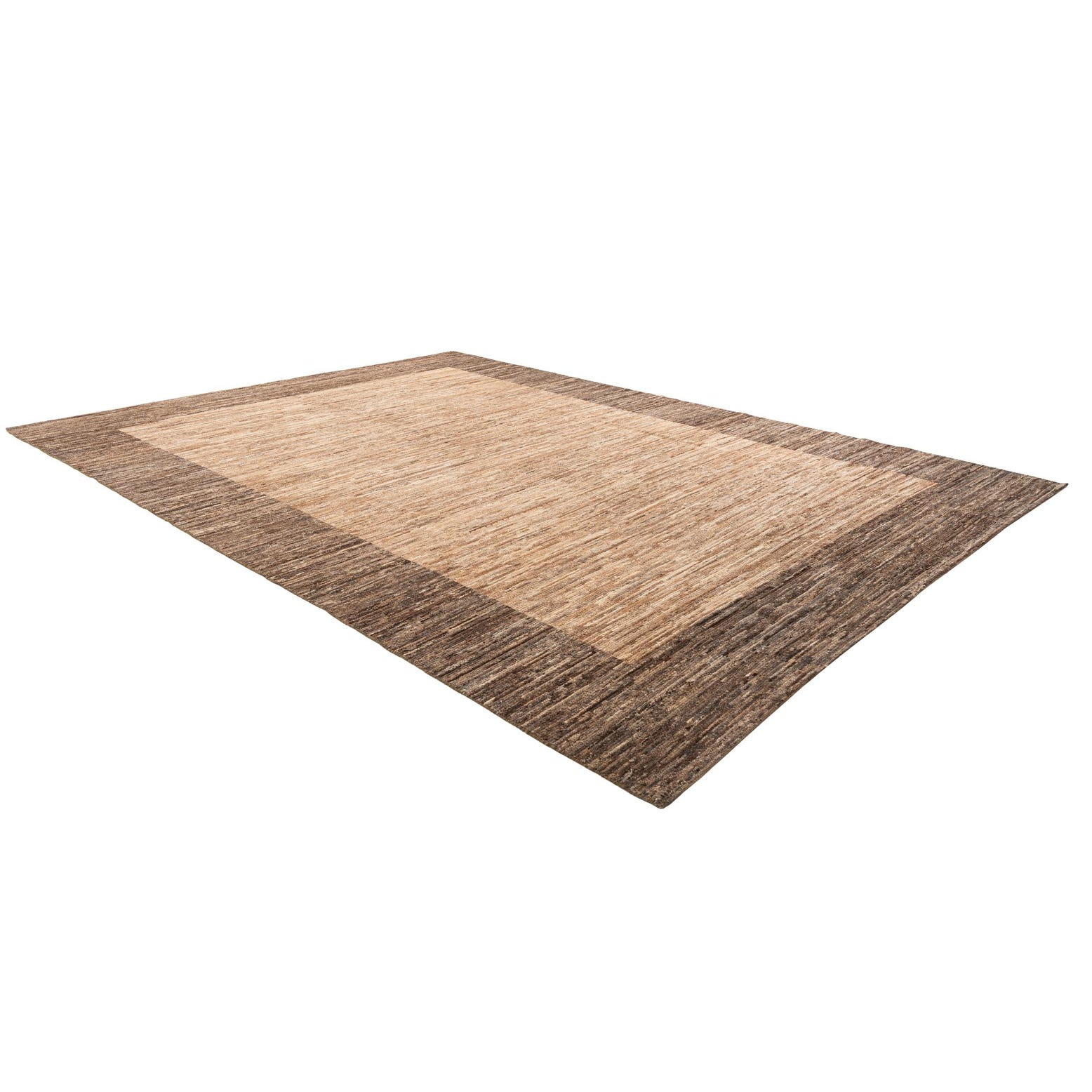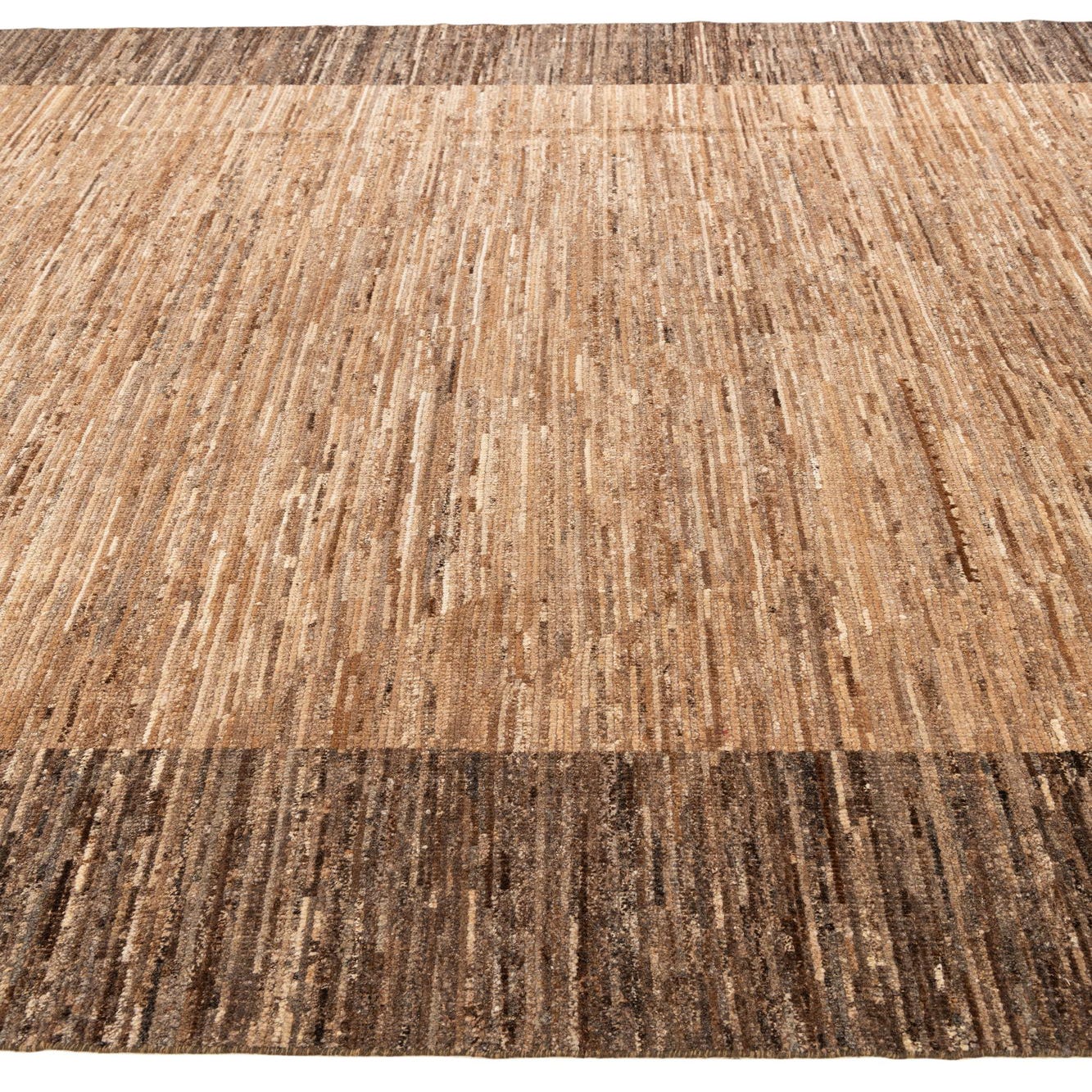 A 10x13 rectangular Modern Ziegler rug featuring a light brown center and a darker brown border, made from hand-spun wool.