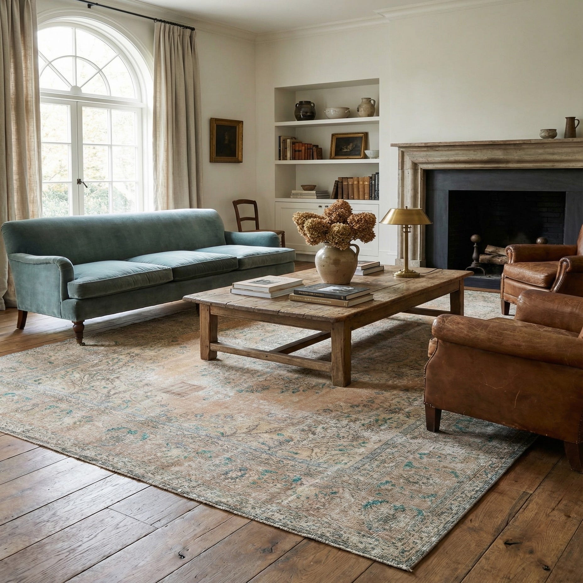 A 10x13 rectangular Ultra Vintage Persian rug in shades of brown and tan, featuring a distressed floral pattern and border.