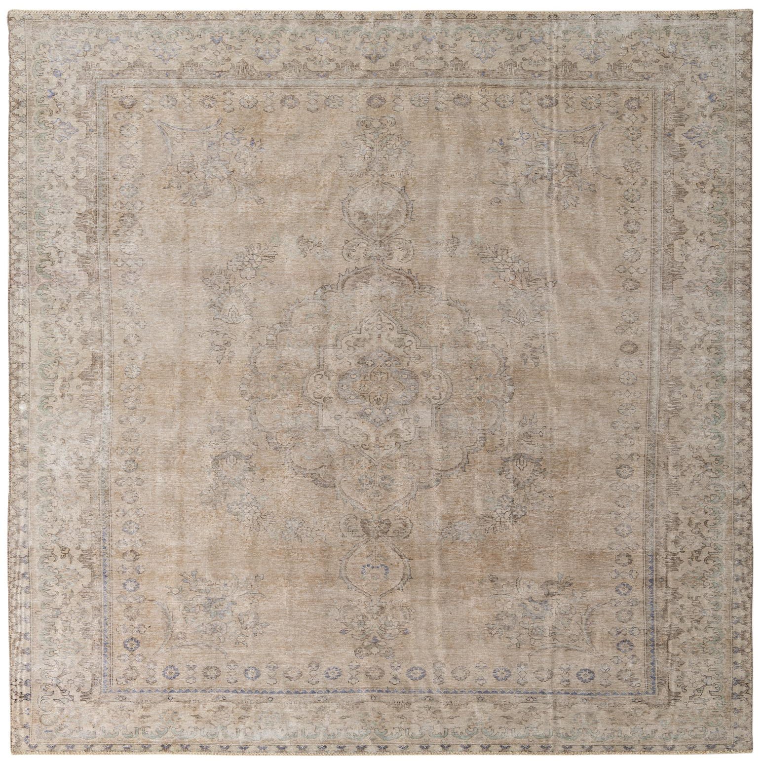 The Ultra Vintage collection presents an elegantly hand-knotted rug, crafted from 100% wool, ensuring both durability and a soft, luxurious feel underfoot. This 10x13 piece offers a nuanced palette of light brown, beige, brown, and blue, complemented by the light brown background that creates a subtle, refined canvas for the design. The traditional pattern features intricate detailing and an ornamental central medallion, encased by a decorative border, evoking the timeless beauty of antique textiles.