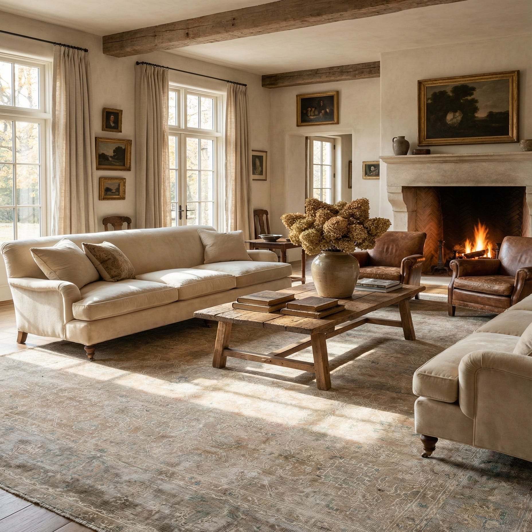 This rug pairs well with natural woods, leather seating, and linen upholstery, bringing subtle pattern to a living room or bedroom without overwhelming the space. It also works under a dining table on hardwood floors or layered in an entry or study to create a grounded, lived-in look. Its muted palette and vintage feel fit transitional, cottage, and traditional interiors as well as modern spaces that favor calm, textural accents.