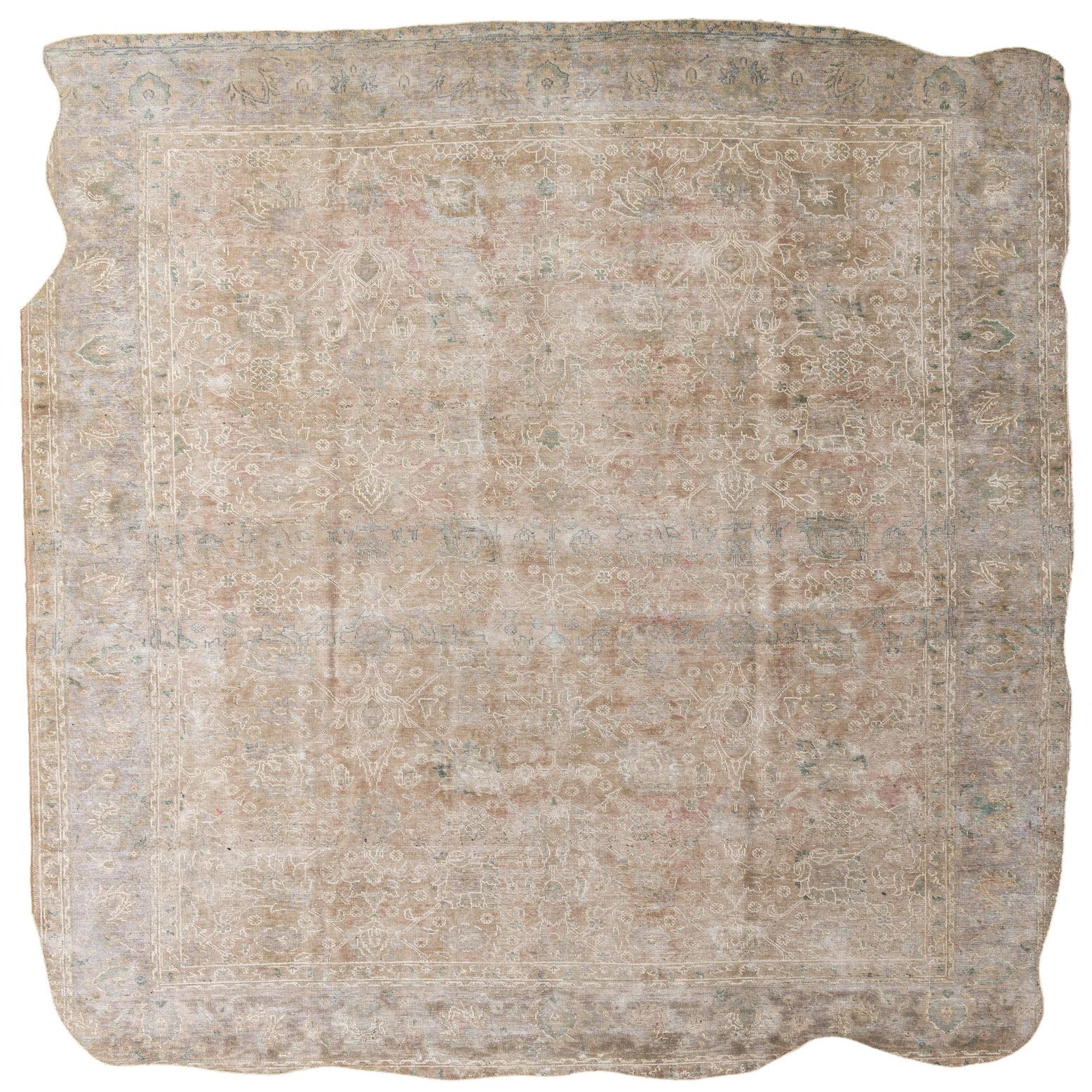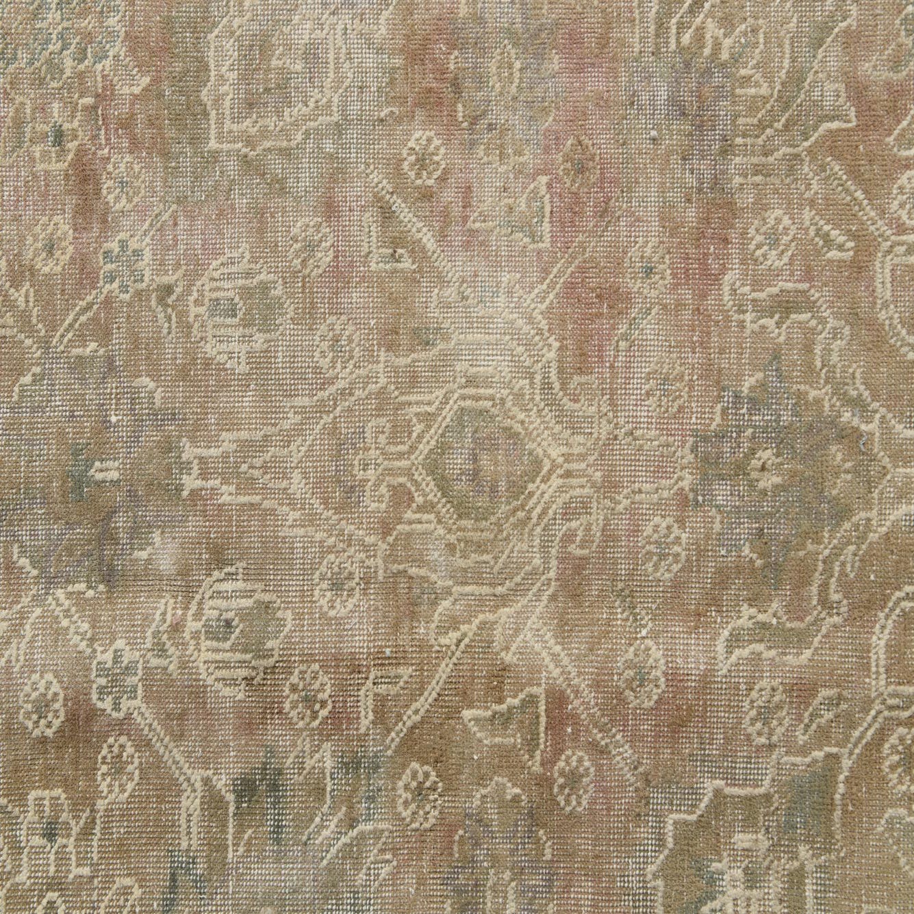 A softly worn, hand-knotted wool rug with a traditional, allover floral and arabesque pattern. The light brown background provides a warm neutral field while brown and ivory outlines define the delicate medallion and vine motifs. Hints of olive and muted red appear throughout the design, adding depth and a quietly layered color story. The surface has a low, tactile pile typical of hand-knotted wool—soft underfoot with gentle variation that highlights the rug’s aged character.