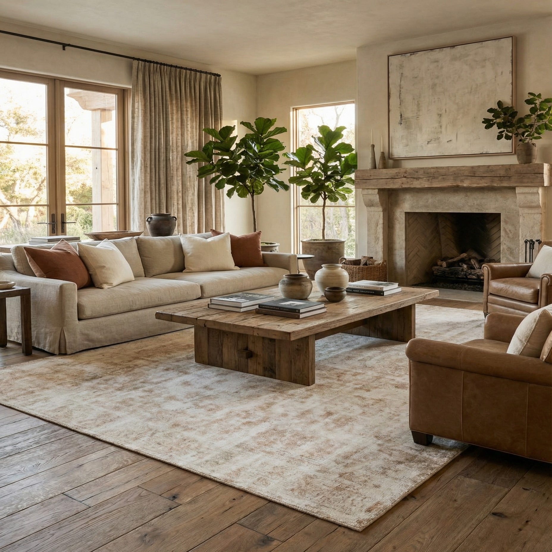 Hand-knotted from 100% wool, the pile has a natural, soft hand and a comfortable weight underfoot, with fine knotting that produces a smooth yet tactile surface. This rug works well as an anchor in a layered living room beneath a sofa and coffee table, as a warm grounding piece in a bedroom under the lower two-thirds of the bed, or as a neutral backdrop for a transitional dining space. It complements Scandinavian, modern farmhouse, and minimalist interiors, and pairs nicely with light woods, leather seating, or linen upholstery.