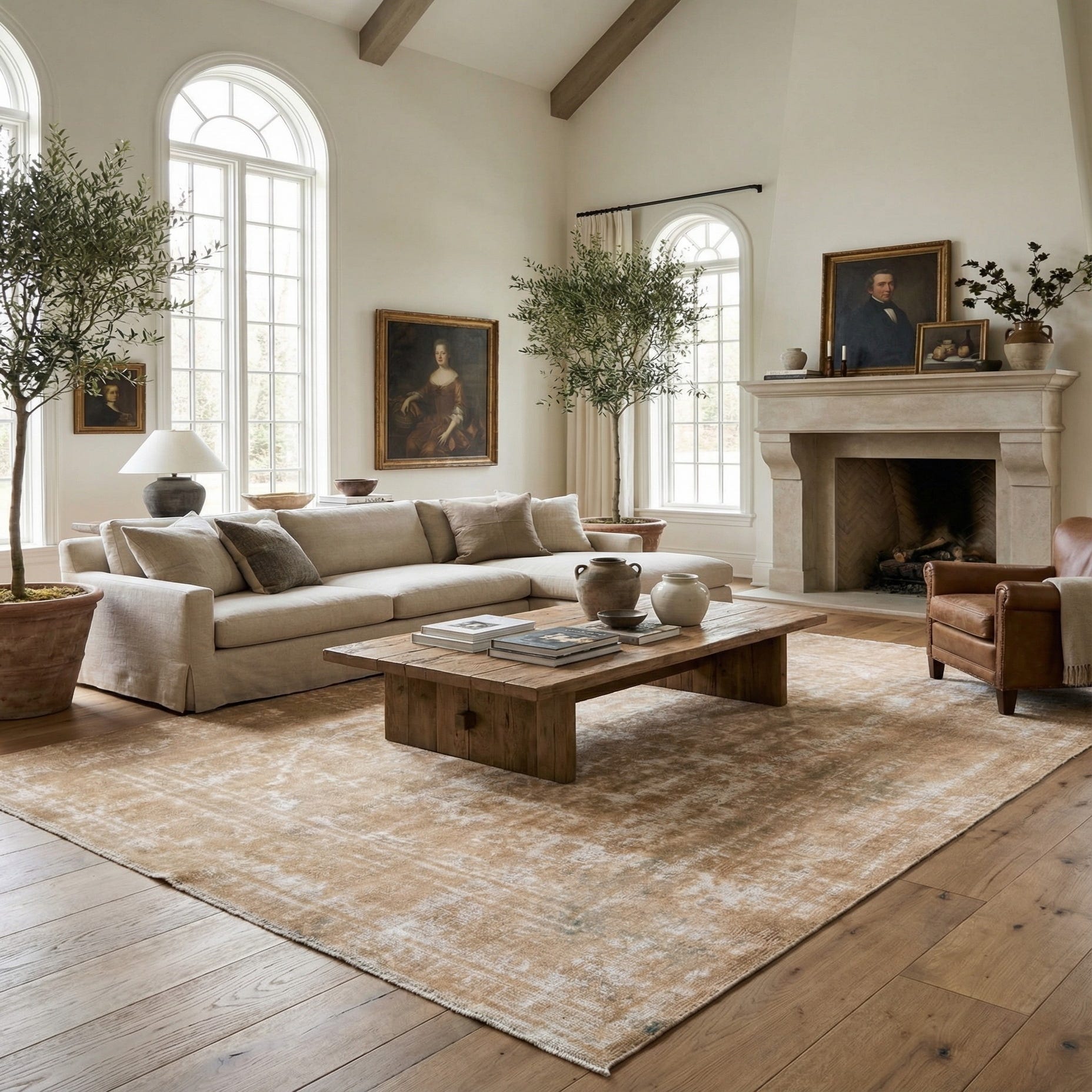 A 10x13 rectangular brown and tan wool rug with a distressed Persian medallion pattern, suitable for a living room.