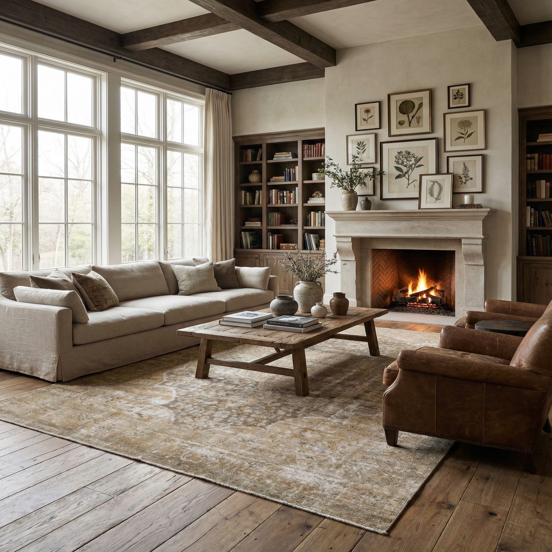 A 10x13 rectangular brown and tan Persian-style rug with a distressed medallion pattern, suitable for a living room.