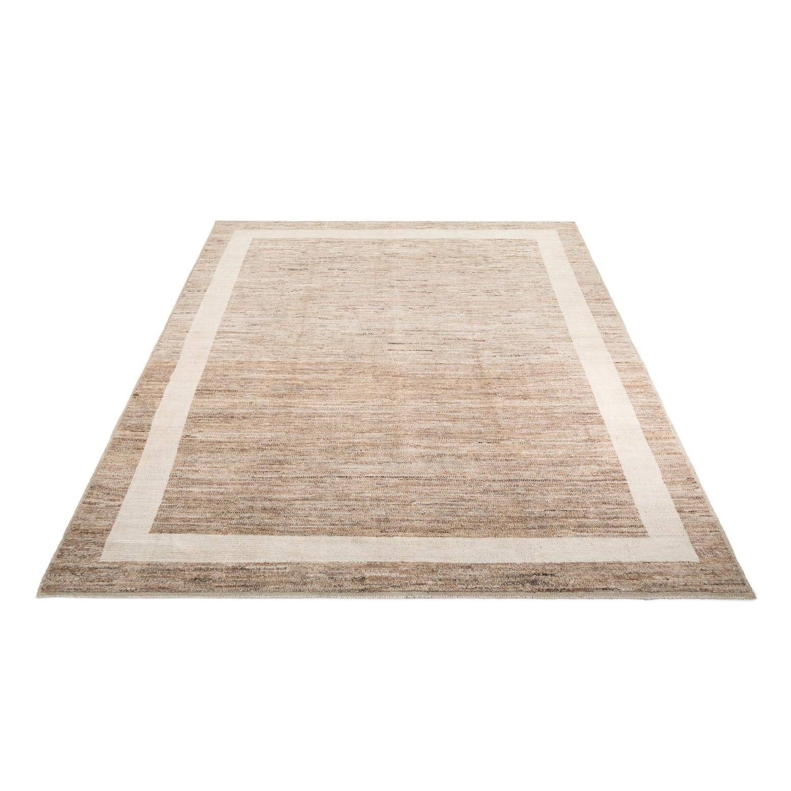 A 10x14 rectangular brown and tan tribal wool shag rug with a thick off-white border.