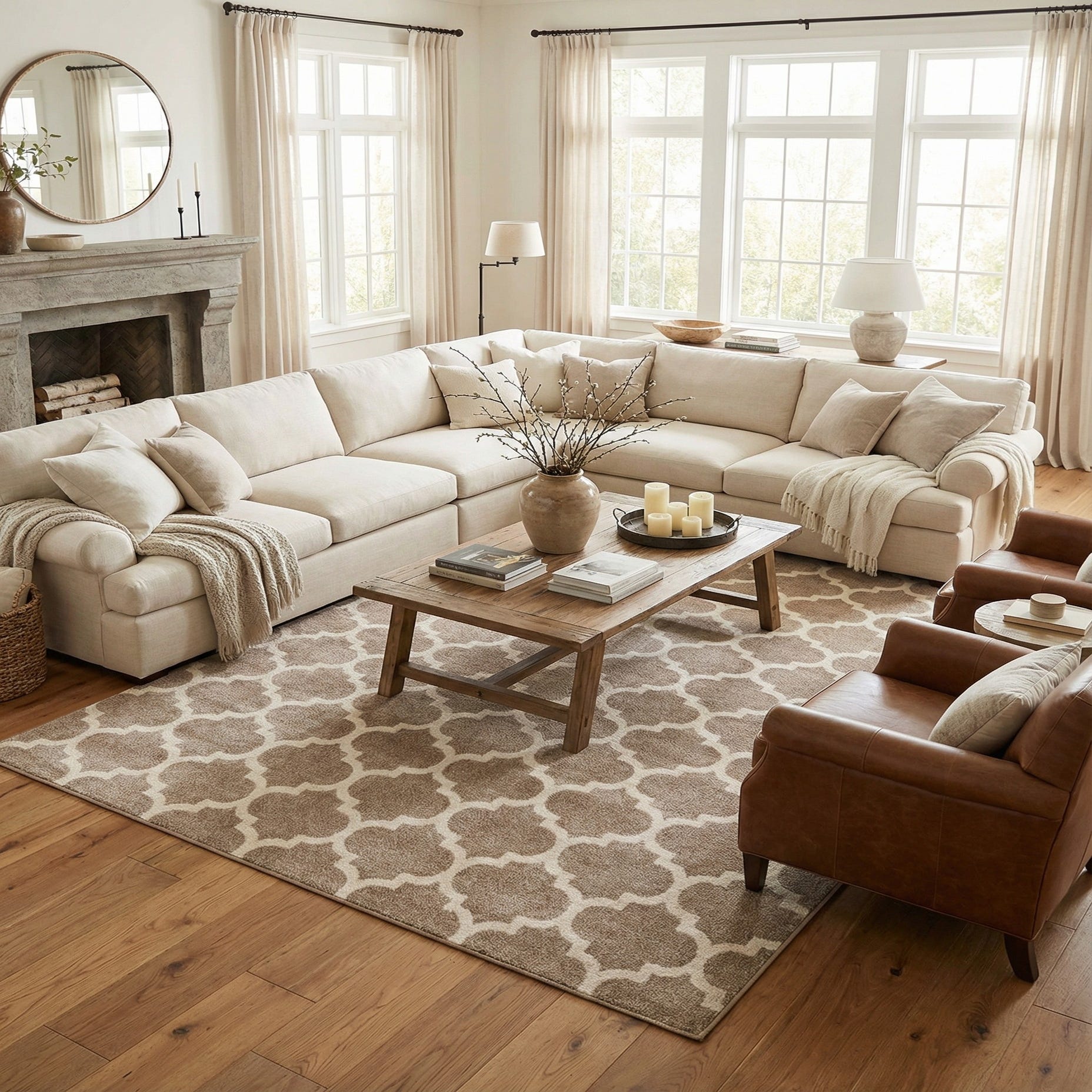 A 10x16 rectangular indoor rug with a modern lattice pattern in varying shades of brown and tan.