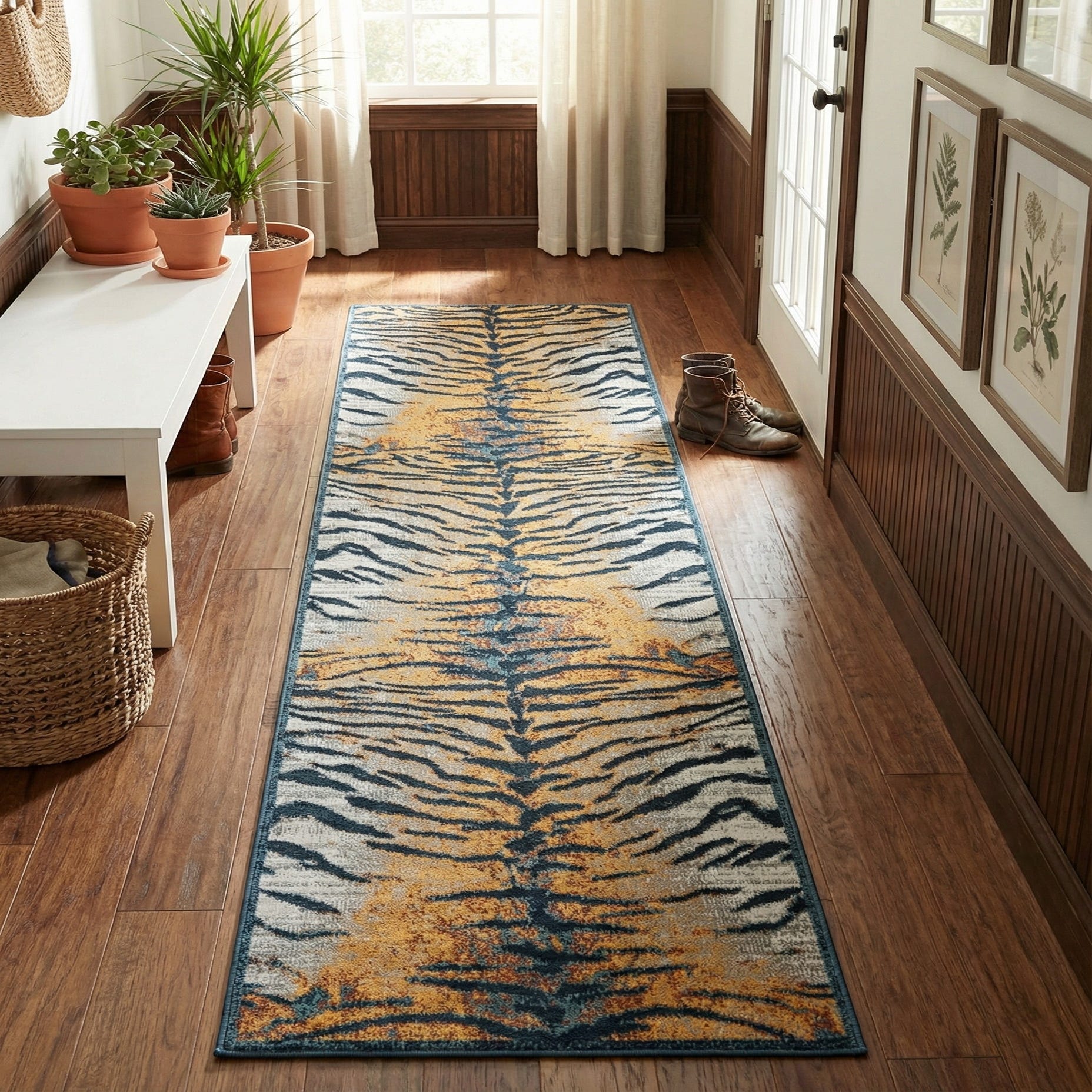 A 12 ft runner rug with a modern tiger stripe pattern in shades of brown, tan, and black, perfect for a hallway.