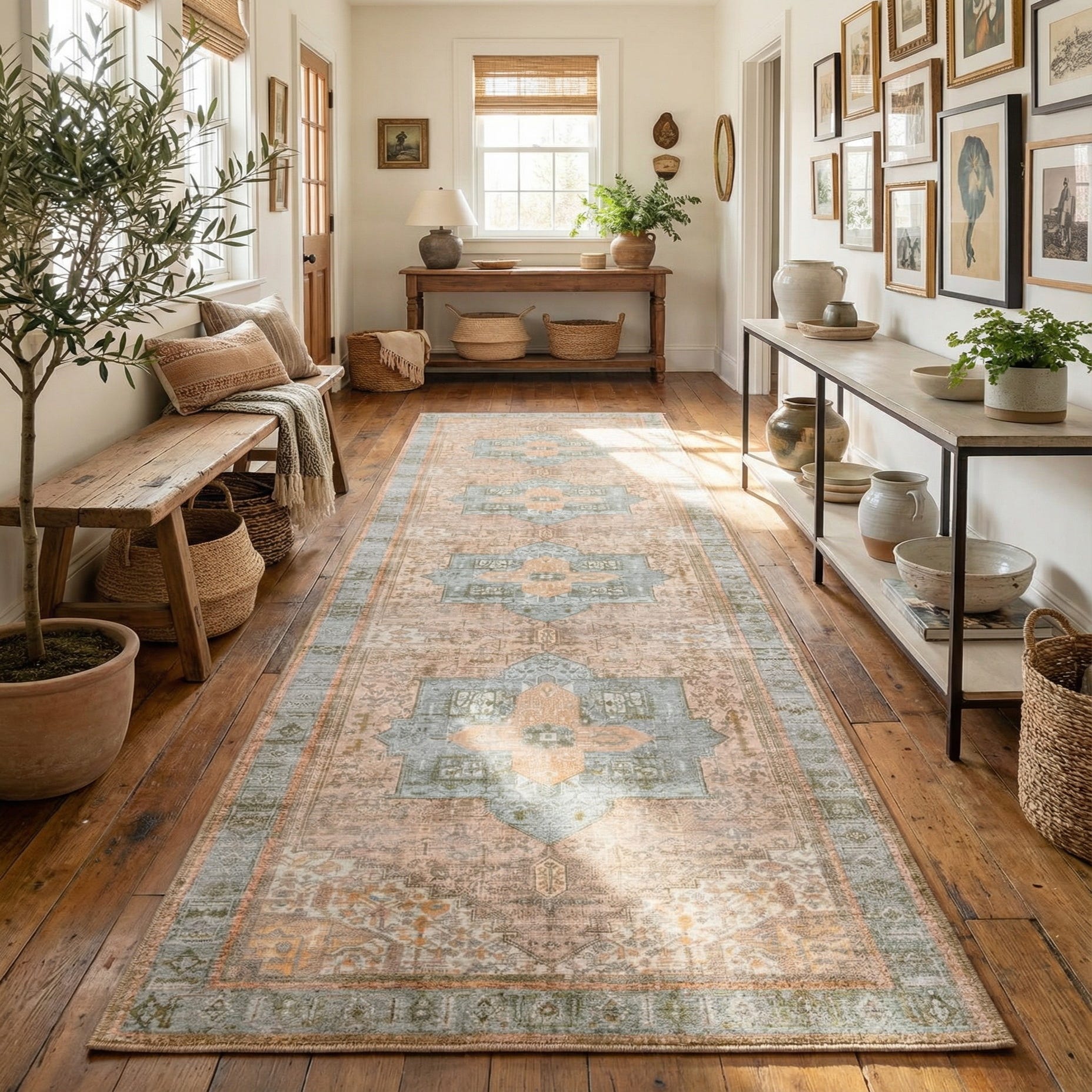 Considering the color palette and pet-friendly nature of this runner, it integrates seamlessly into various interior styles such as transitional, modern farmhouse, and cottage decors. It adds an elegant touch to hallways, entryways or alongside a bed in a bedroom while providing a durable surface that stands up to everyday life.