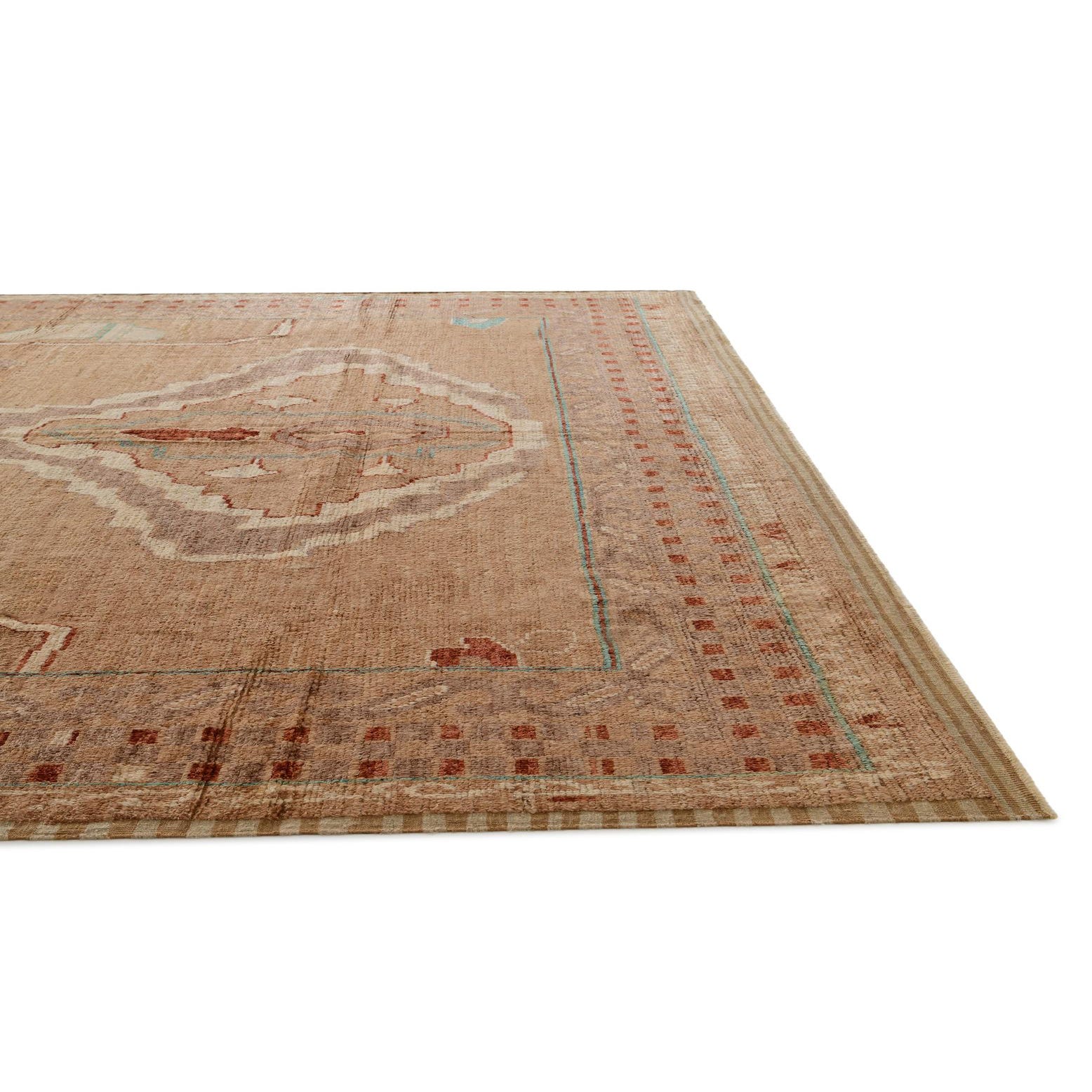 Primary color is Light Brown. Colors in this rug include: Light Brown, Brown, Green, Ivory, Rust Red.