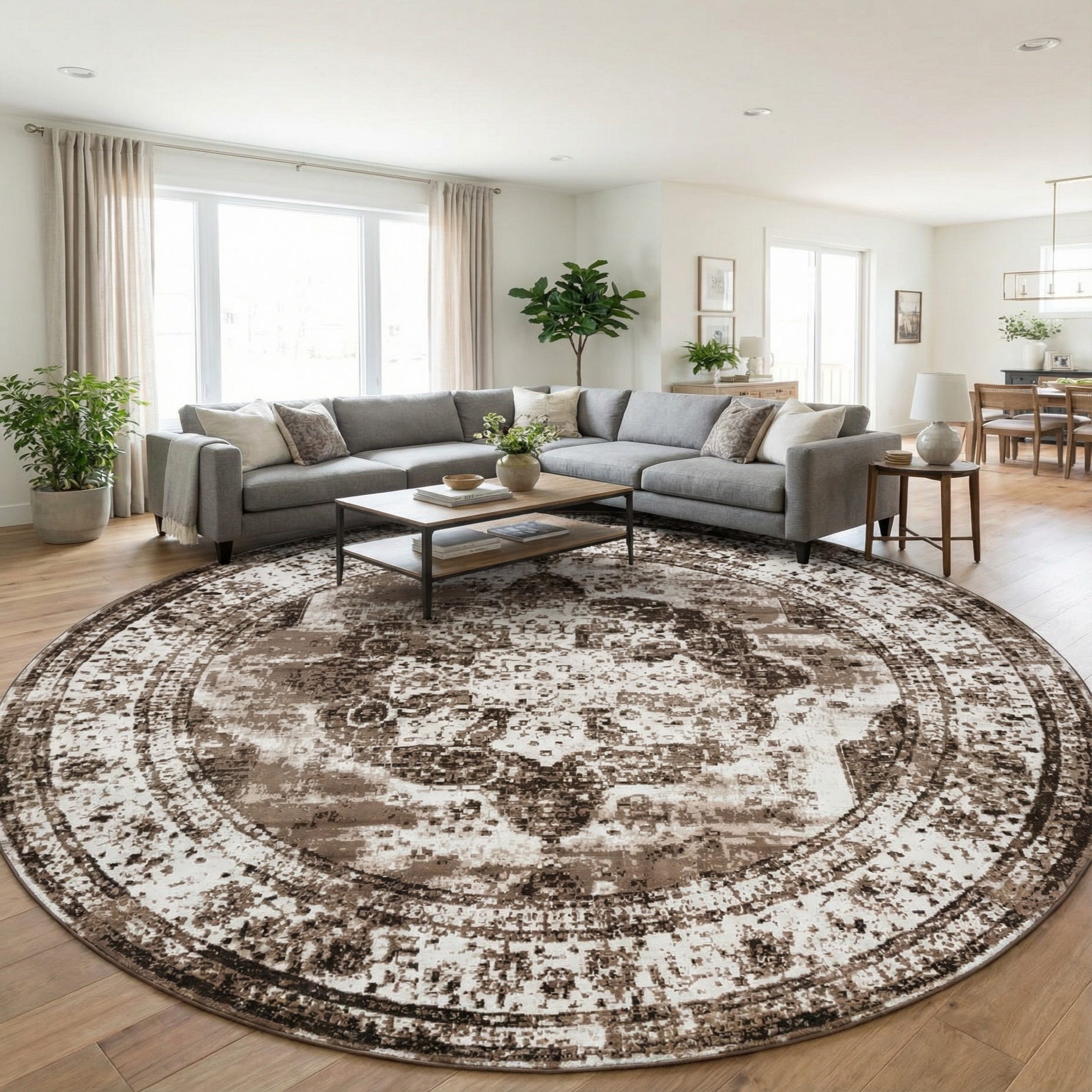 A large round brown and tan vintage medallion rug with a distressed traditional Oriental pattern.