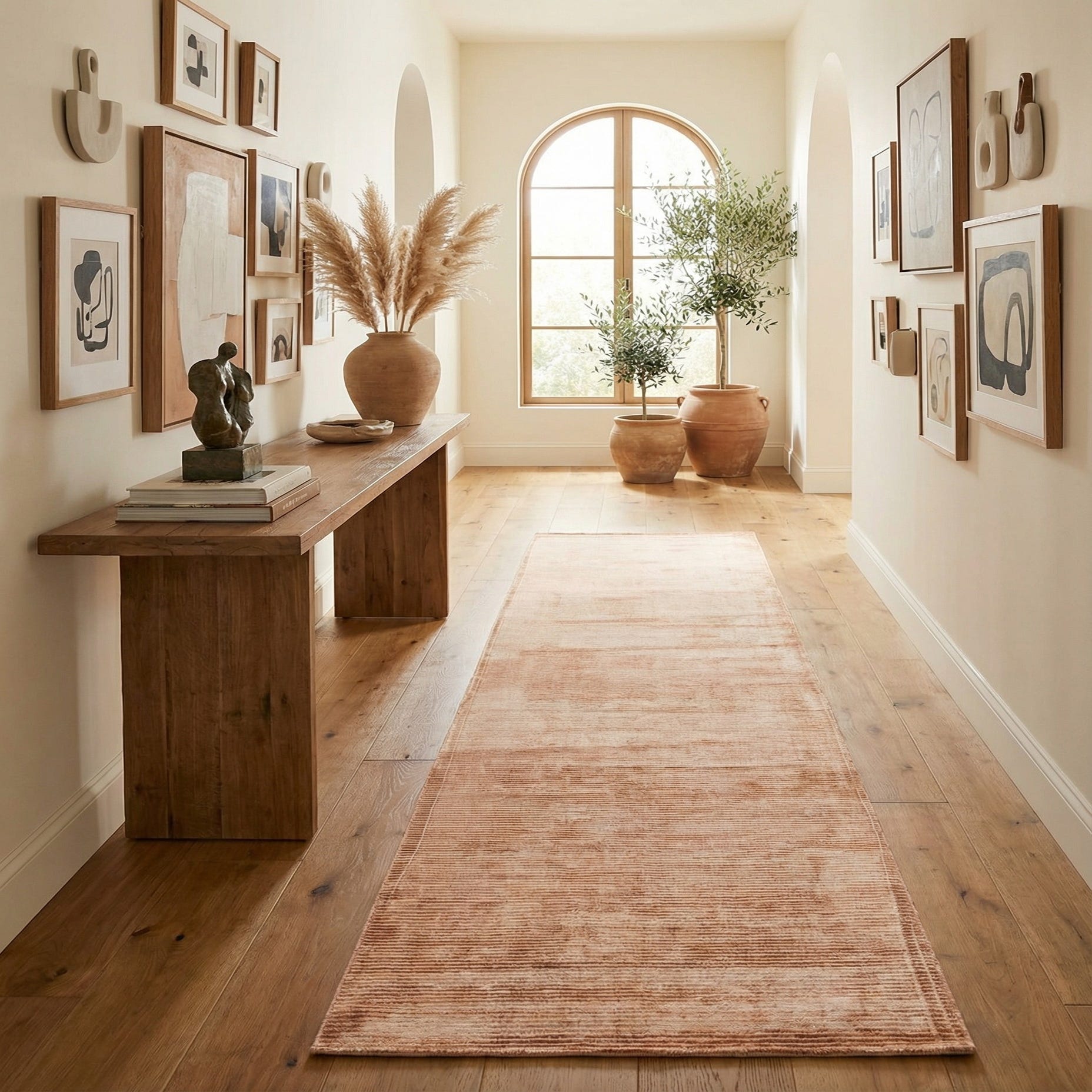 The runner's long, slender shape is well-suited for hallways, entryways or as an elegant transition between spaces in your home. Its minimalist pattern allows it to blend seamlessly with both contemporary and traditional decor, serving as a versatile backdrop for a range of furniture styles.