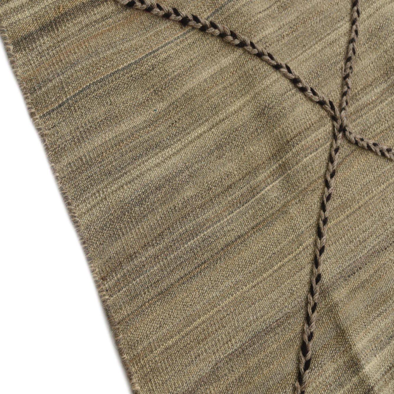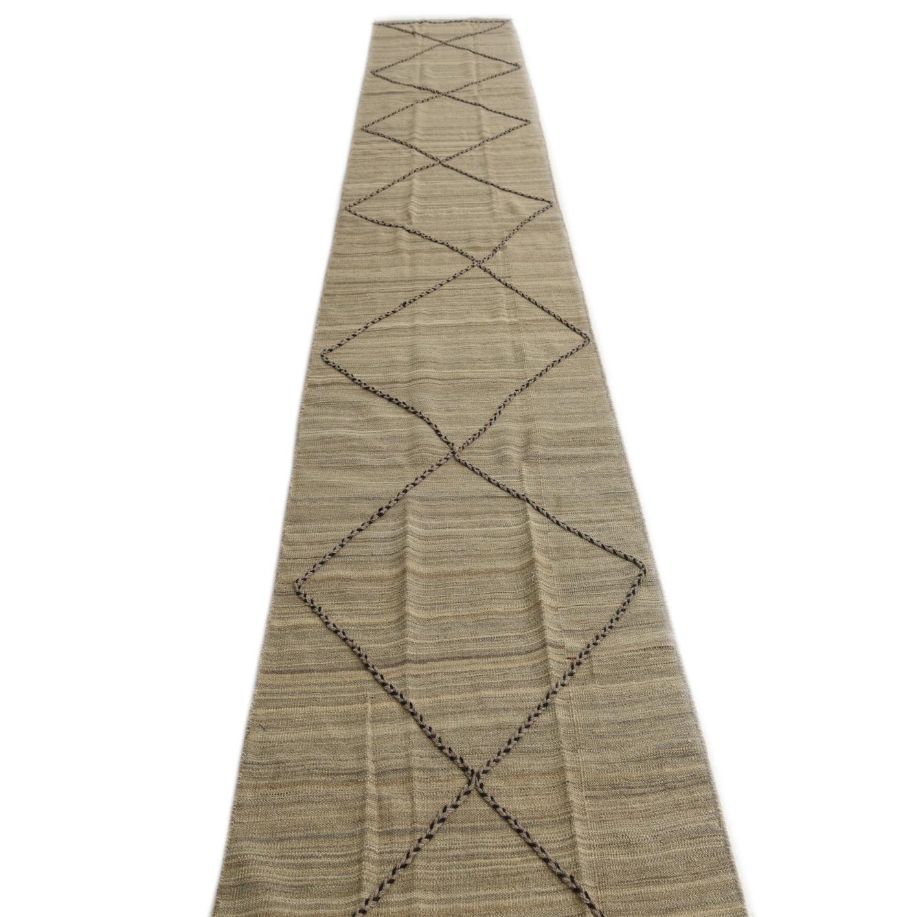 This 15 Ft Runner from the Kilim Modern Collection is a handwoven piece composed of 100% wool, offering a blend of durability and comfort. The rug displays a series of geometric shapes, primarily diamond forms that repeat along its length, creating an engaging and structured pattern. The interconnected diamonds are outlined in black, adding contrast on the light brown background, while additional shades of beige, brown, and gray weave through the rug's field, presenting a neutral color palette that can complement a range of interior designs.