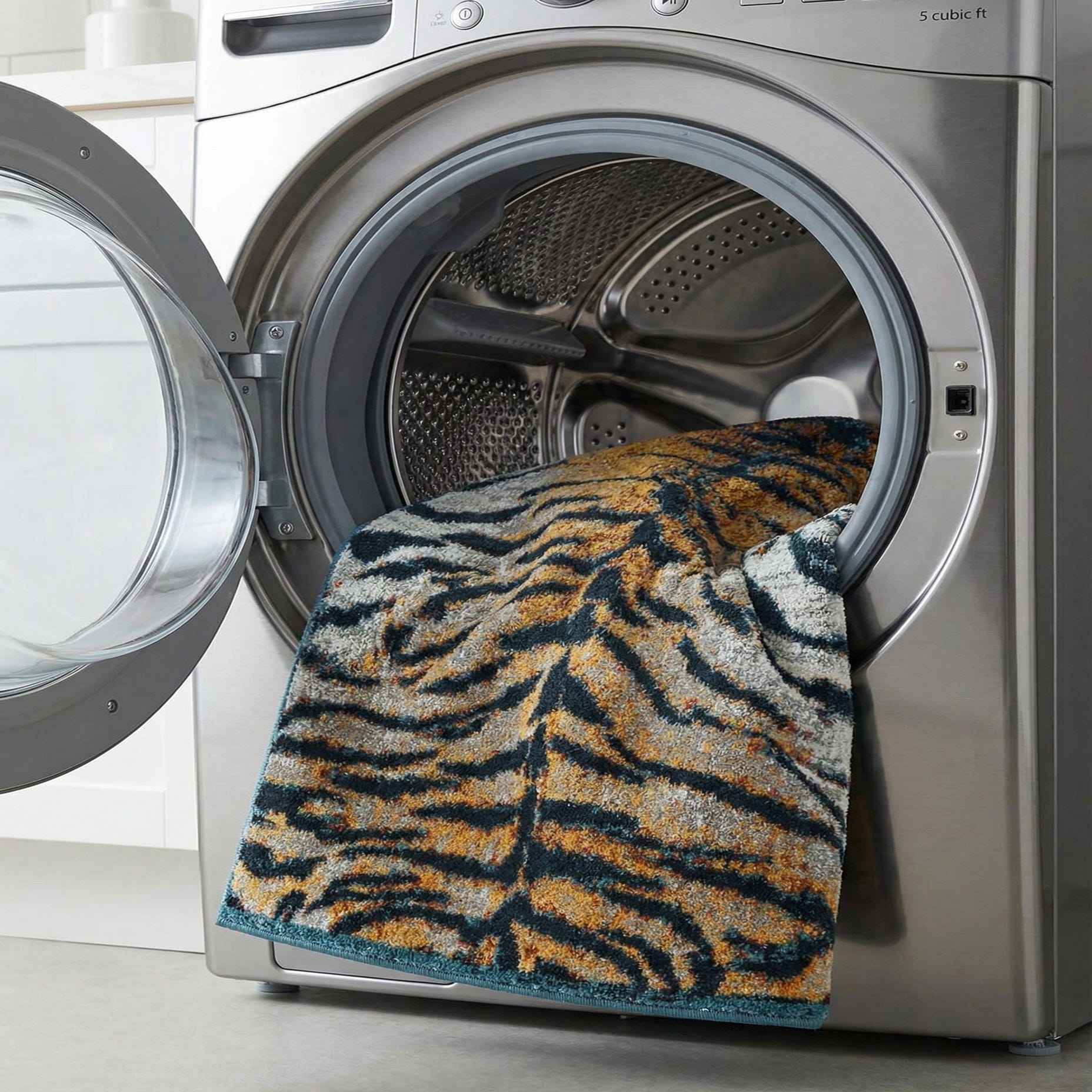 A rectangular 2x3 Kamala Washable rug featuring a modern tiger stripe pattern in shades of brown, tan, black, and blue.