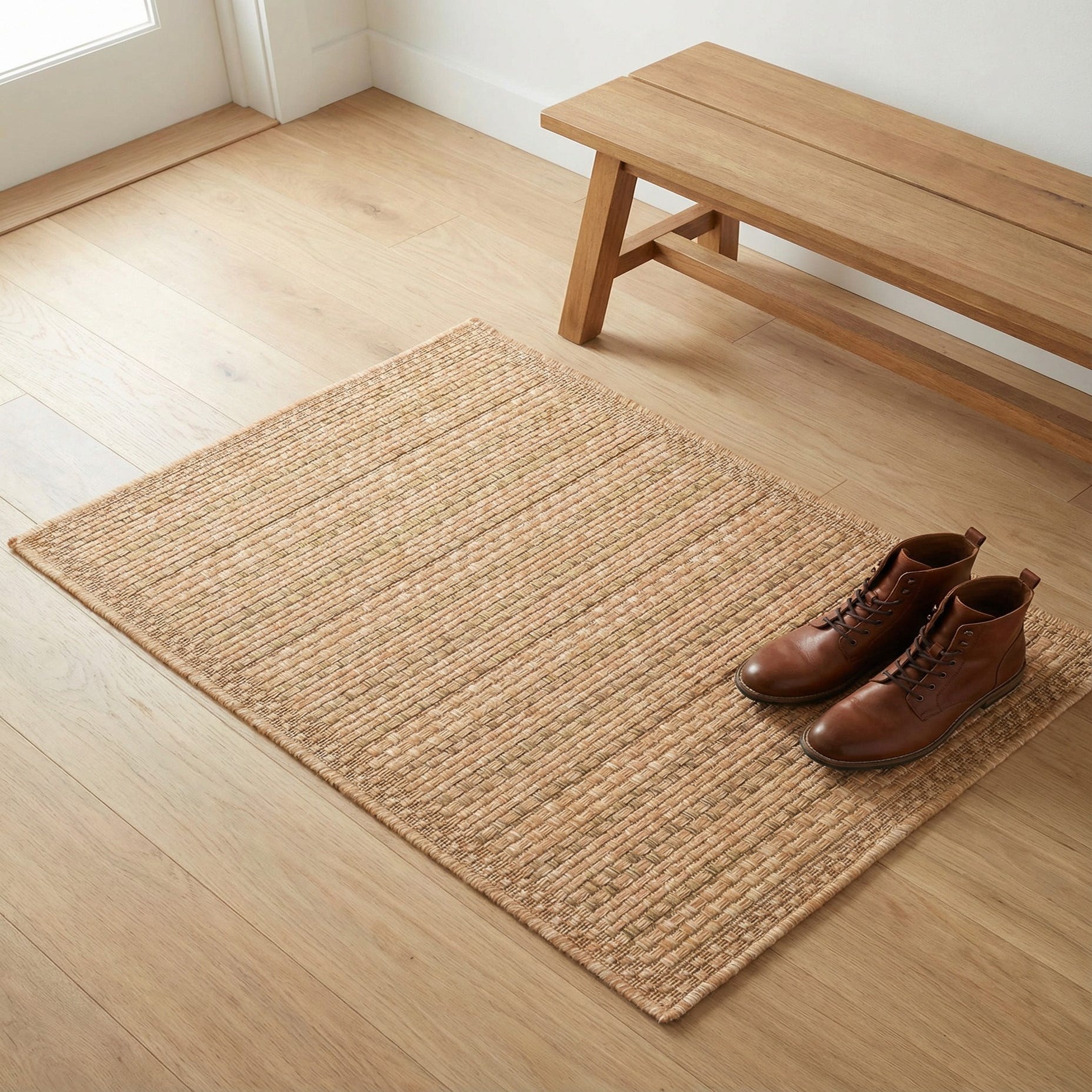 A tight basketweave pattern gives this rug a clean, structured look, with small square motifs forming a subtle grid across a warm light brown field. Narrow, slightly darker horizontal bands and a simple stitched border add quiet definition without drawing the eye away from the overall texture. Machine made from 100% polypropylene, the rug has a low-profile, tightly woven surface that feels firm underfoot with a slight textured grain that echoes natural fiber rugs.
