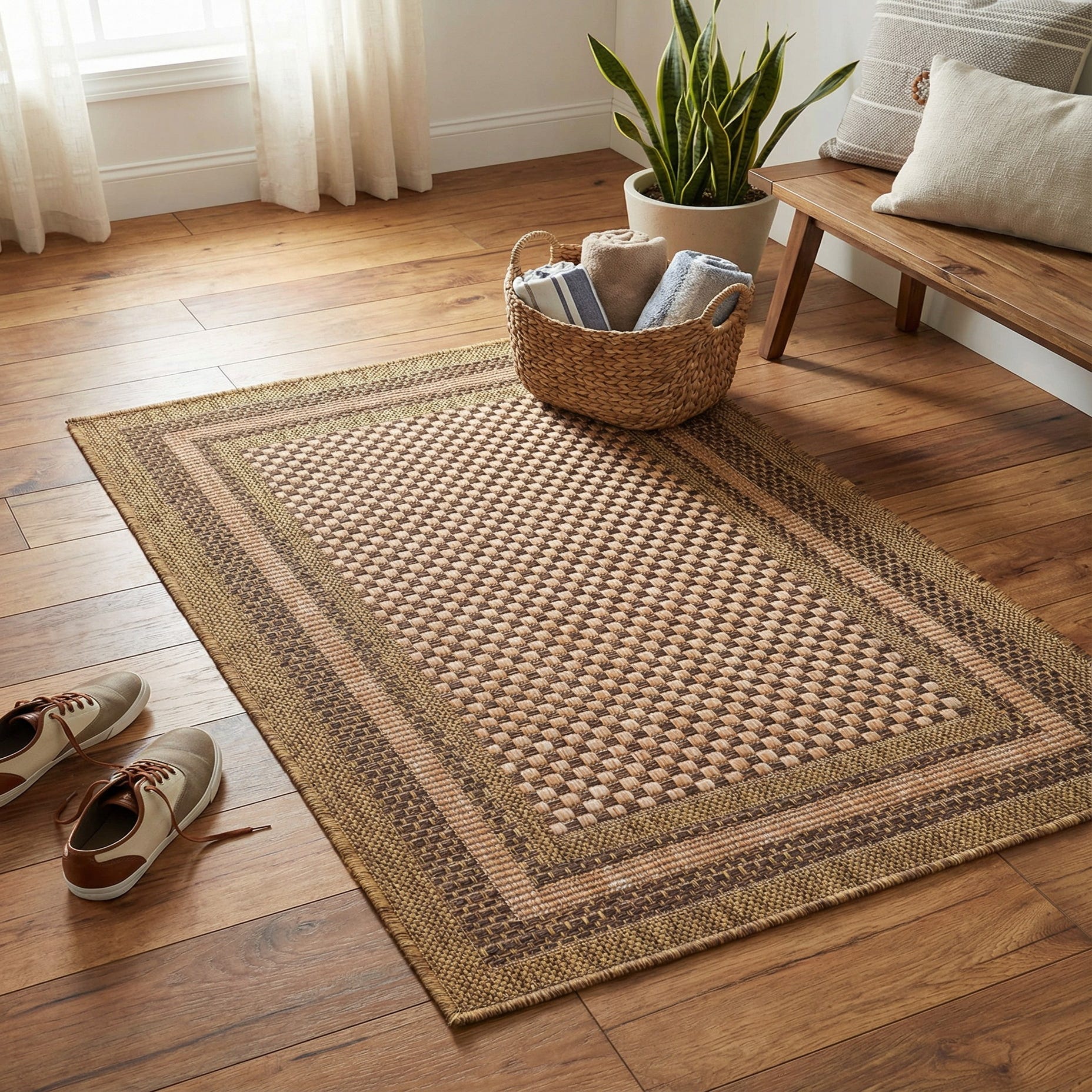 Warm, neutral tones make this piece an easy anchor for casual and transitional settings. Pair it with natural wood or rattan furniture on a covered patio or sunroom, or use it indoors beneath a small bistro table or in an entryway to define a welcoming zone. It also complements coastal, farmhouse, and rustic-modern schemes, and its flat weave fits well under dining chairs or layered with a larger area rug for added texture.