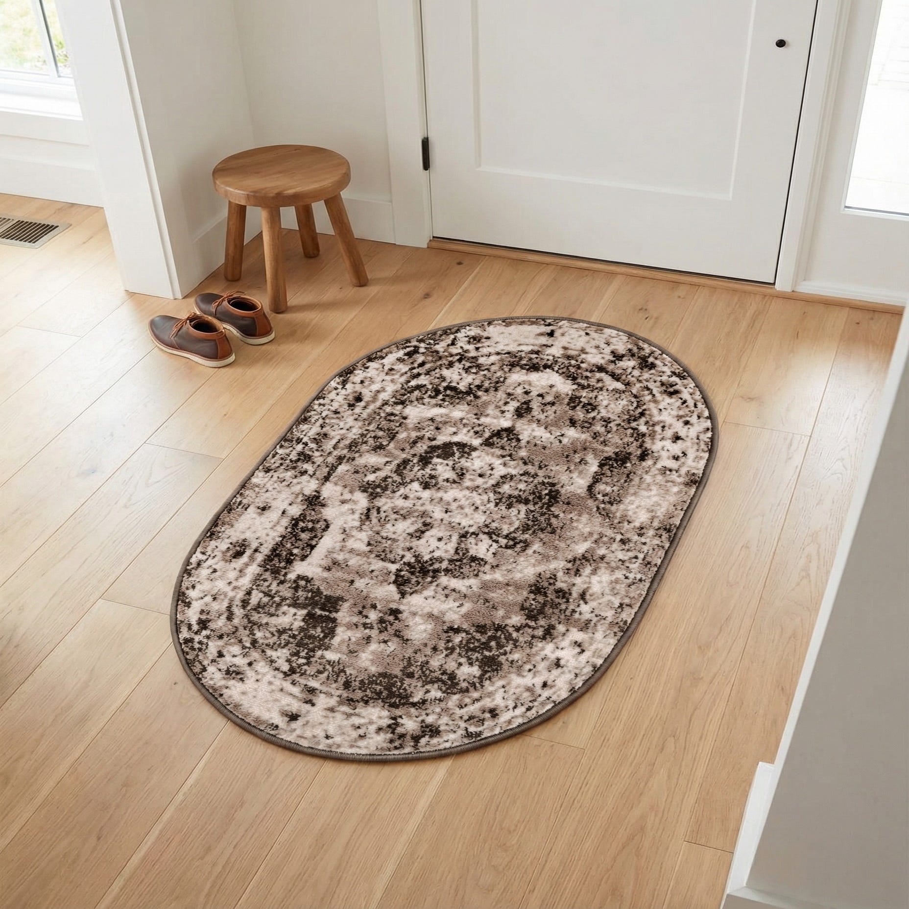 The Monte Carlo collection presents a 2x3 oval rug crafted with premium 100% polypropylene fibers, ensuring a durable and long-lasting floor covering. This piece exhibits a distressed pattern, blending a light brown background with layers of brown and ivory accents, culminating in traditional motifs with a contemporary edge.