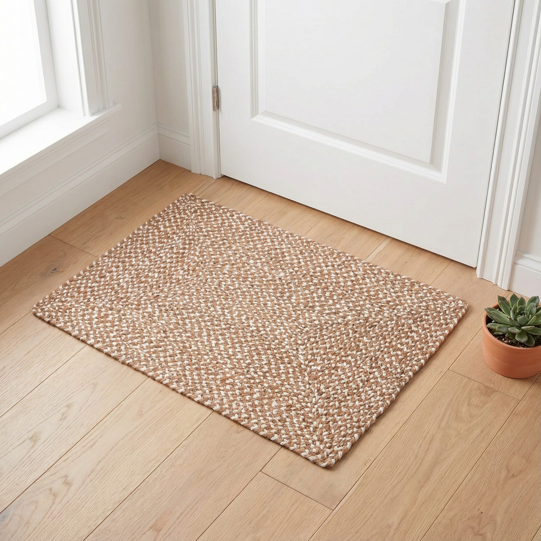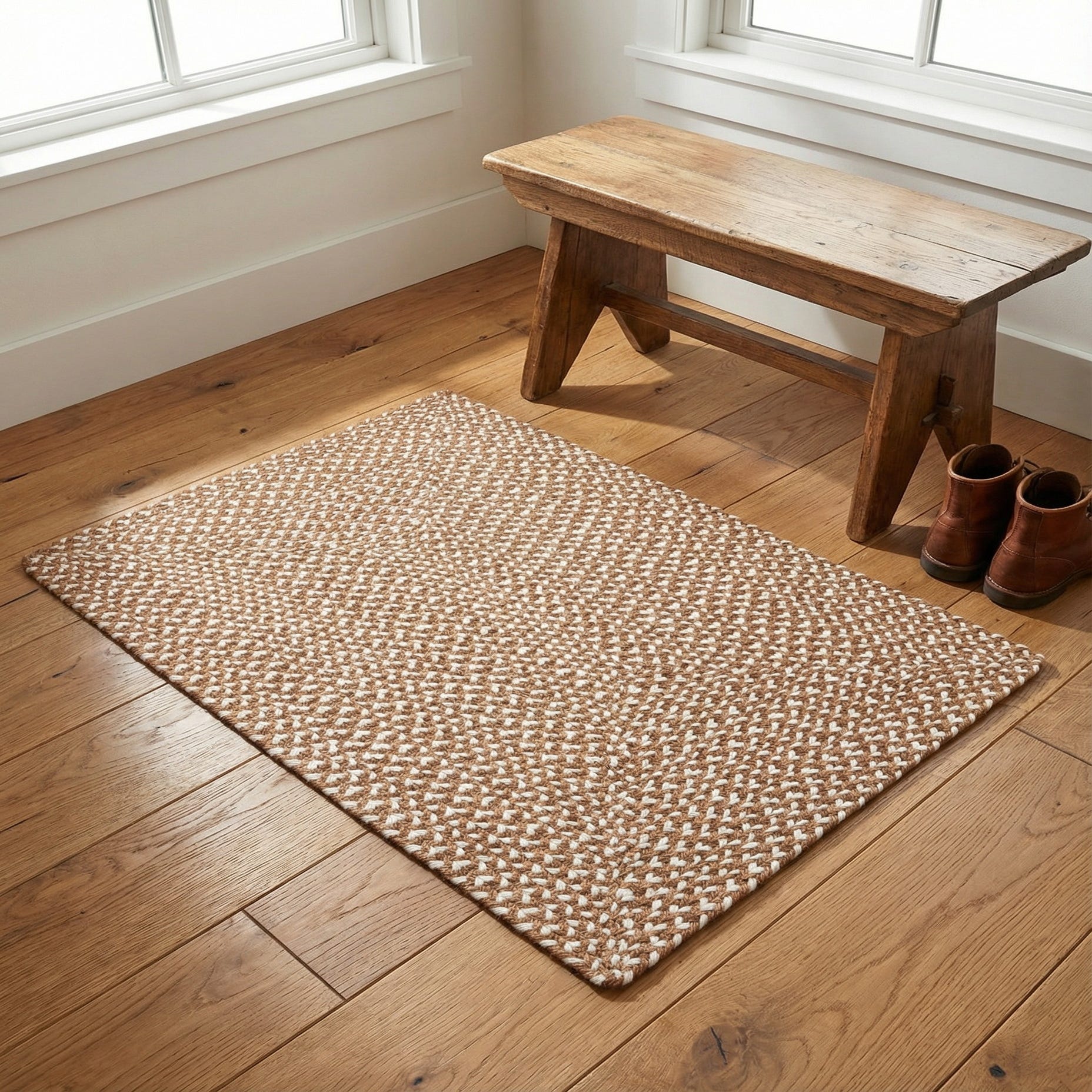 Hand-braided from 100% jute, this rug displays a tight, rectilinear braided pattern that forms a subtle framed center. Light brown braided strands woven with ivory create a two-tone, tweed-like effect that adds visual depth without bold contrast. The low, braided profile feels firm and textured underfoot, with the natural fiber strands giving the surface a handcrafted, organic look.