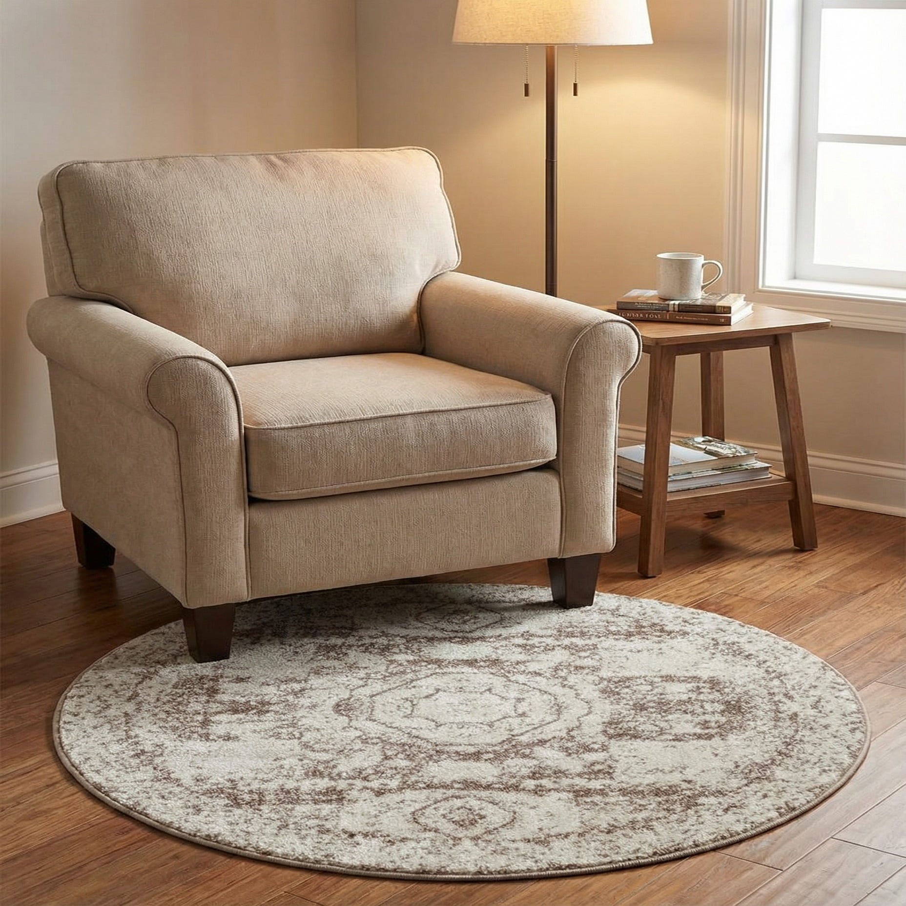 A softly distressed medallion pattern fills the round field, with an octagonal center motif and faded border details that give the design a settled, vintage-inspired look. Ivory and beige accents sit against a light brown background, creating gentle contrast and tonal depth that fits both classic and contemporary palettes. The pattern reads as intentionally weathered rather than high-contrast, so it layers easily with wood tones, neutral upholstery, or woven textures.